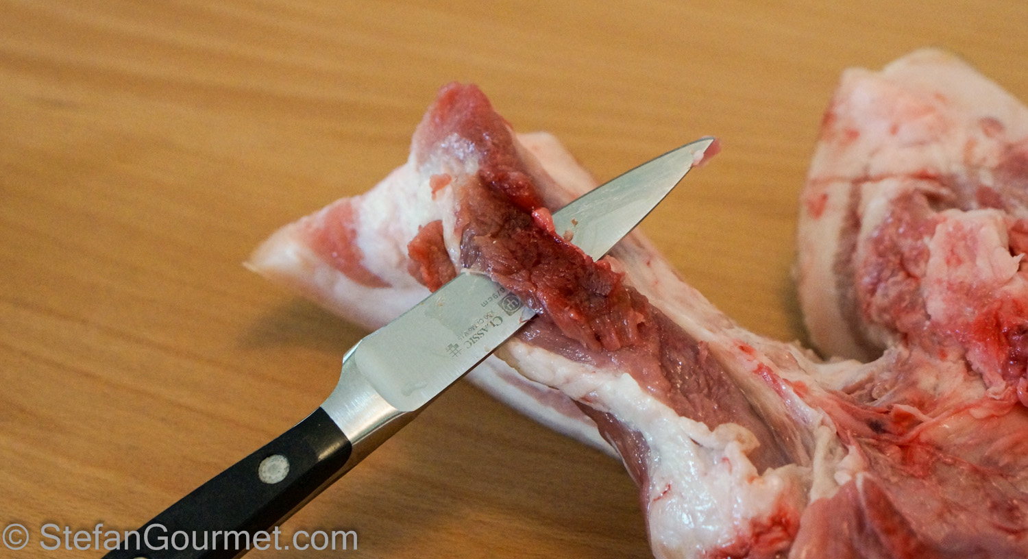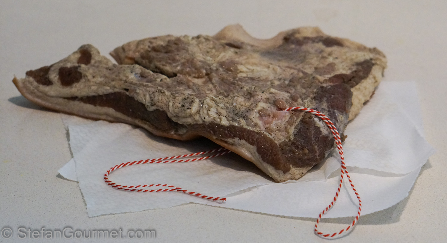 Make a hole in the pork jowl with a sharp knife to hang it.
