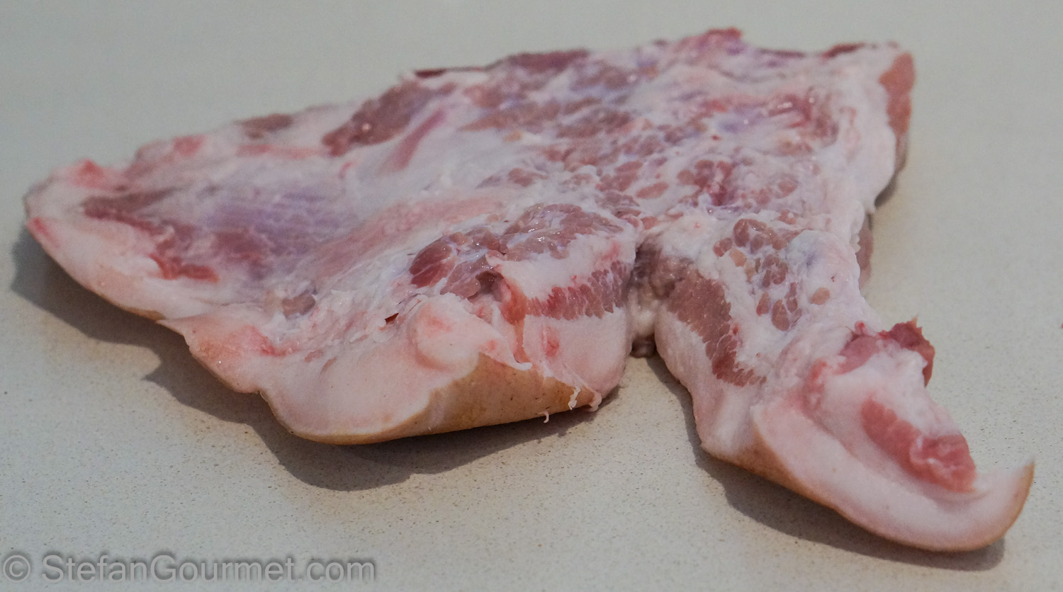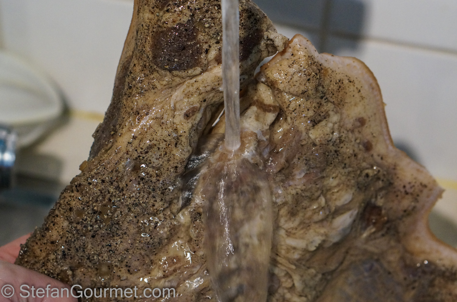Take the pork jowl out of the bag and wash it under cold running water, removing all of the curing mix.