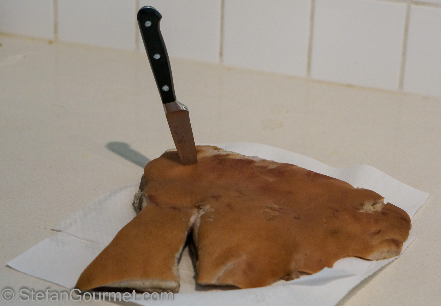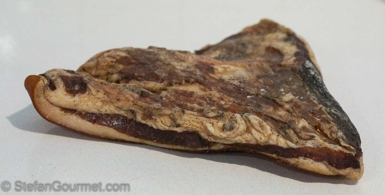 Keep trimming until it looks clean. Then rinse the pork jowl under cold running water and pat dry with paper towels.