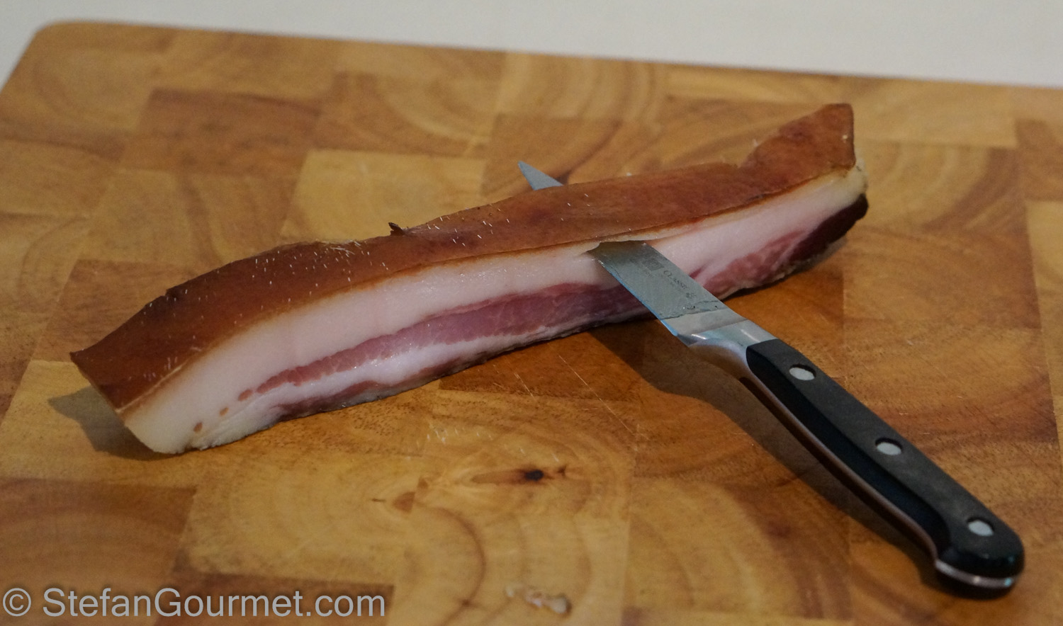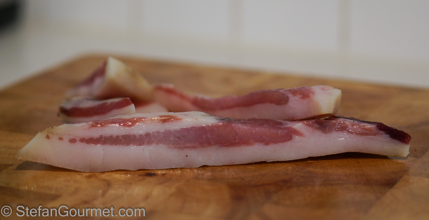Trim the rind with a sharp knife. I find this easier to do when the guanciale has been cut into thick strips.