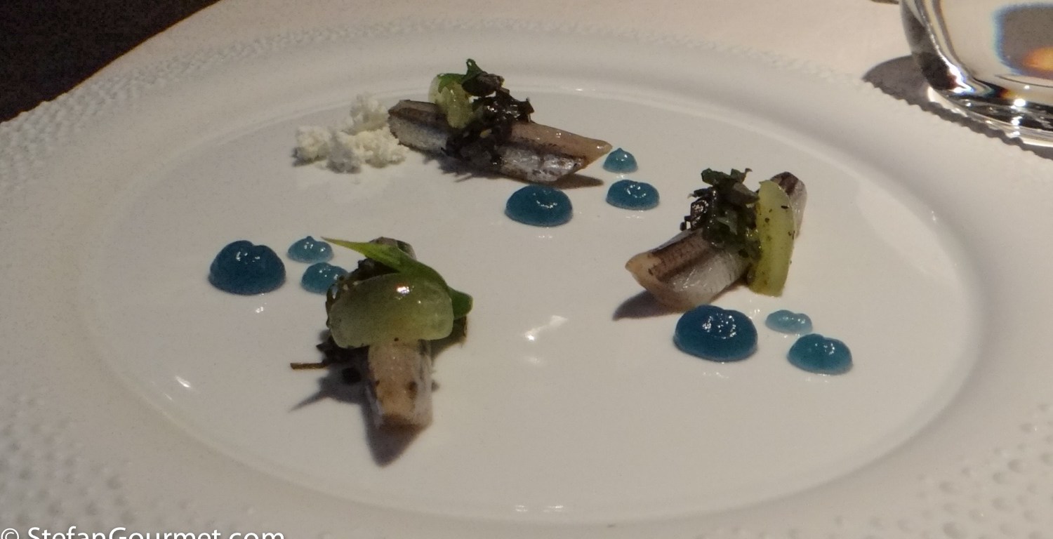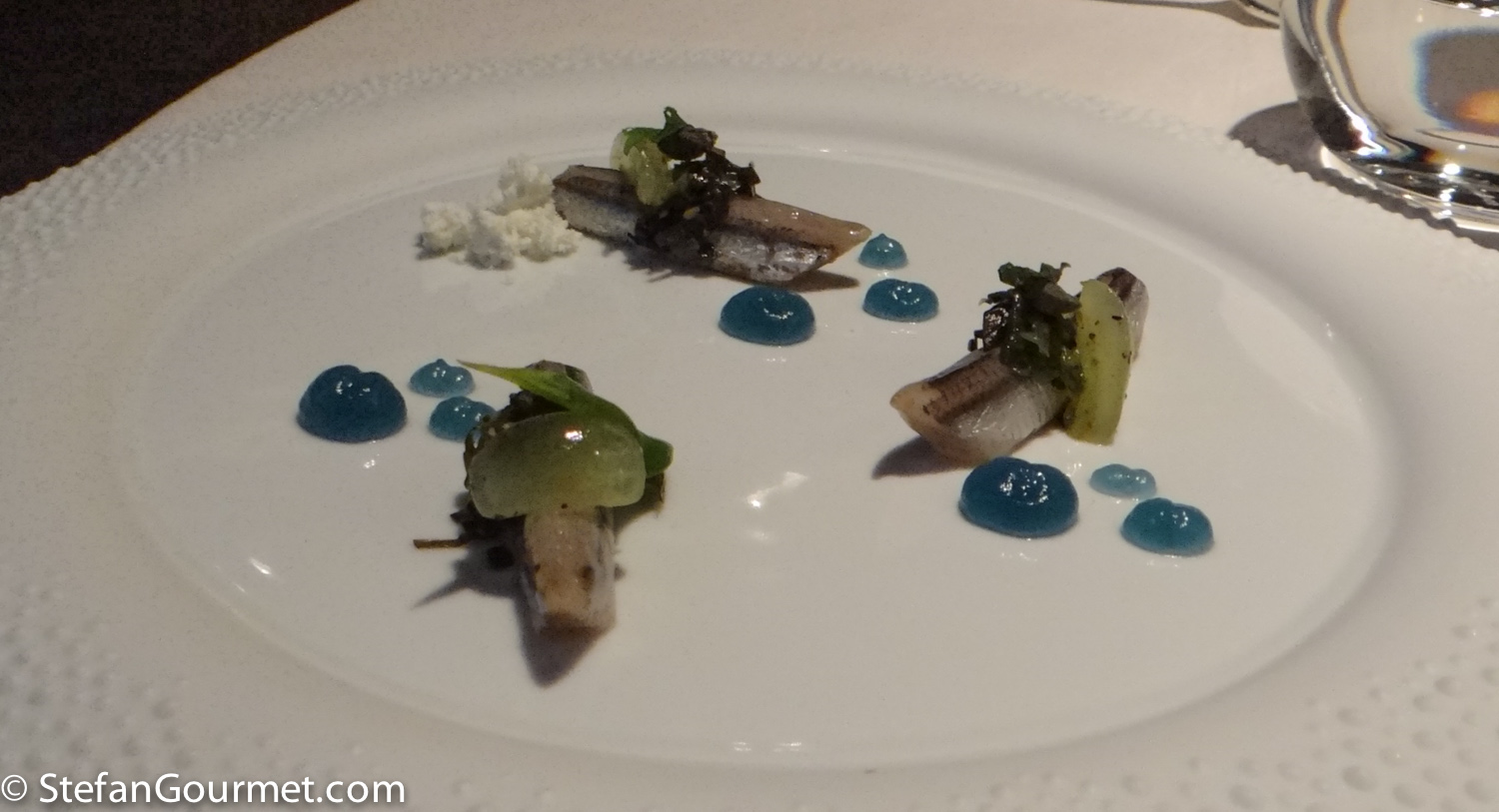 The first course “alici tra soar e carpione” is a large type of anchovies (alici) prepared literally between carpione (Milano style) and saor (Venice style). It was absolutely delicious, and a good pairing with a very nice Mosel riesling. The blue drops made of red cabbage were more for decoration as they had no flavor, but they sure looked great.