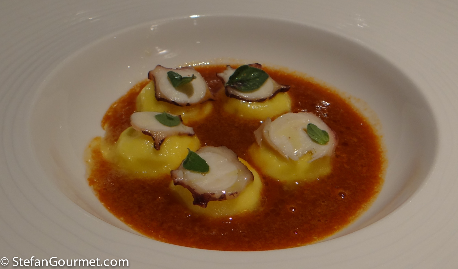 These ‘bottoni’ (buttons) are like ravioli without edges, stuffed with ricotta and lime, and served in a ‘caciucco’ (shellfish) sauce and octopus. Again a very nice dish, and a great pairing with a Meursault. The citrus and minerality of the Meursault worked very well with the dish. 10/10