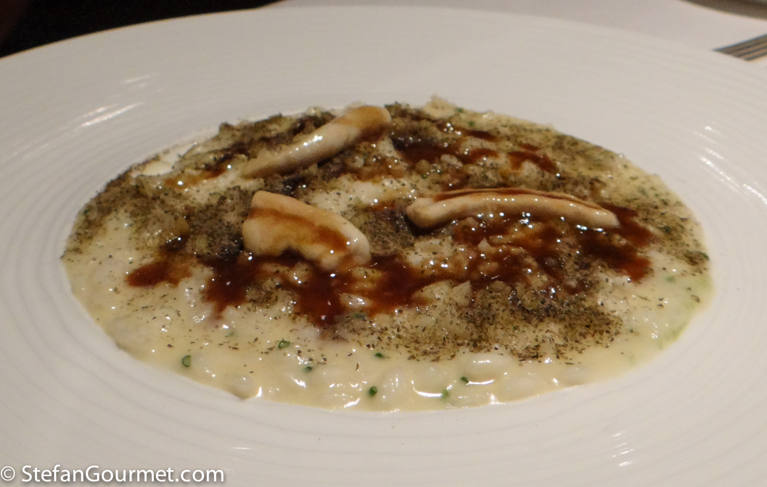 By now we were thinking we were eating in a three-star restaurant, as all these antipasti were certainly at that level. Time for the primo piatto, risotto with bone marrow, capers and spices. This was paired with a Pessac Leognan from 1996 (!), that went very well with the almond flavors present in the dish. The risotto was al dente to the point of being crunchy, which is not how we like it. It was still a good dish. 8/10