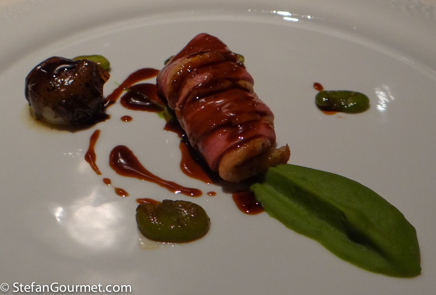 The duck breast is served with an original presentation: sliced and then rolled up. The skin is not crunchy but soft. It is served with a puree of fava beans and paired well with a nebbiolo. The duck is unfortunately not as tender and flavorful as it can be. Not a bad dish, but not at the level of the rest. 7/10