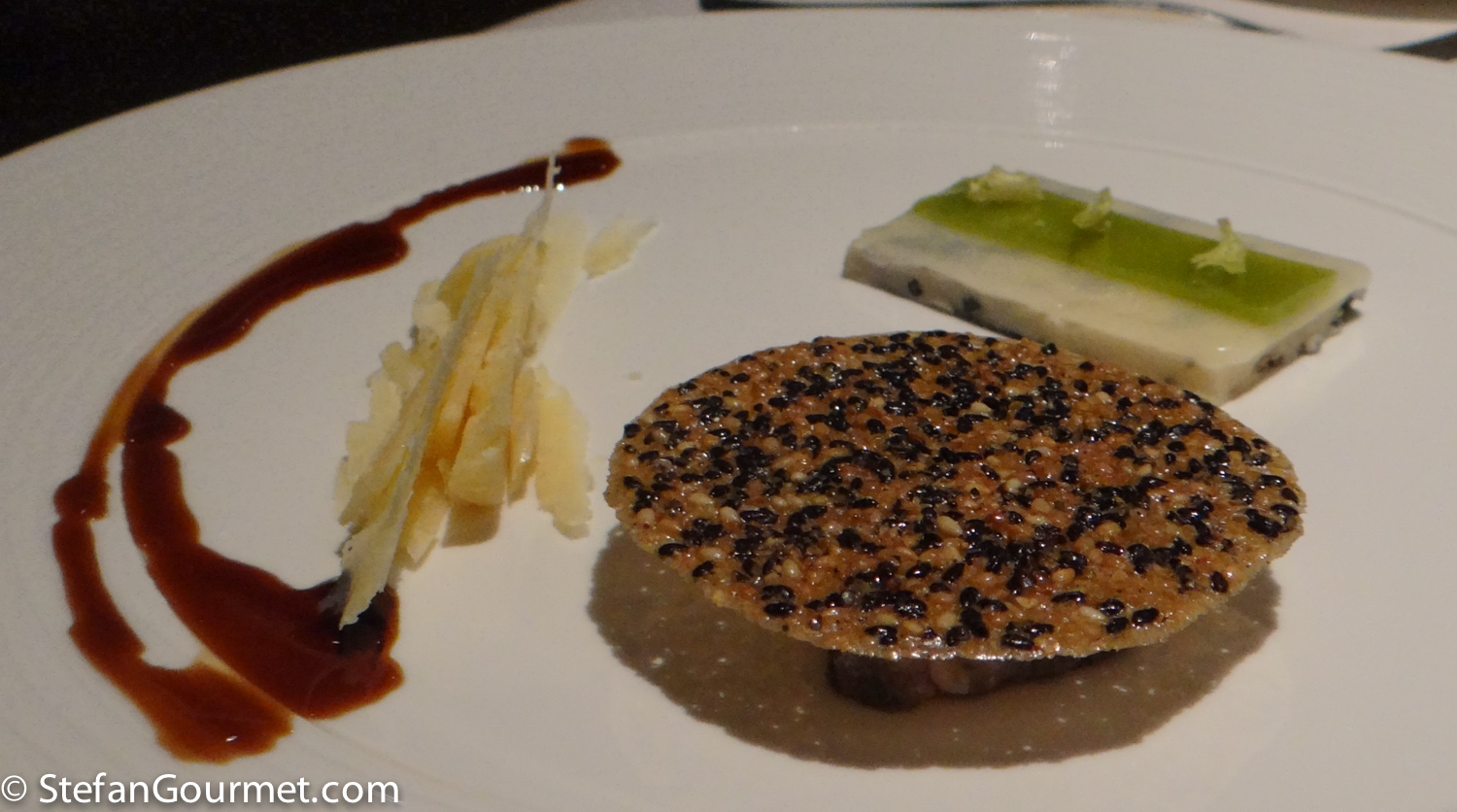 Scallops with yuzu and chicken may sound like a weird combination, but it is very tasty indeed and one of the best of the evening thanks to the outstanding wine pairing. The chicken is present as very crispy chicken as well as very concentrated chicken stock. The scallops are raw. The yuzu brings it all together. Unctuous scallops, crispy chicken skin, fresh yuzu and umami of the chicken stock. What was very special is that the timorasso, a white wine from Piemonte, brings out an oyster flavor in the scallops that is not there before you take a sip of the wine. That’s how wine pairings are supposed to be, well done! 10/10
