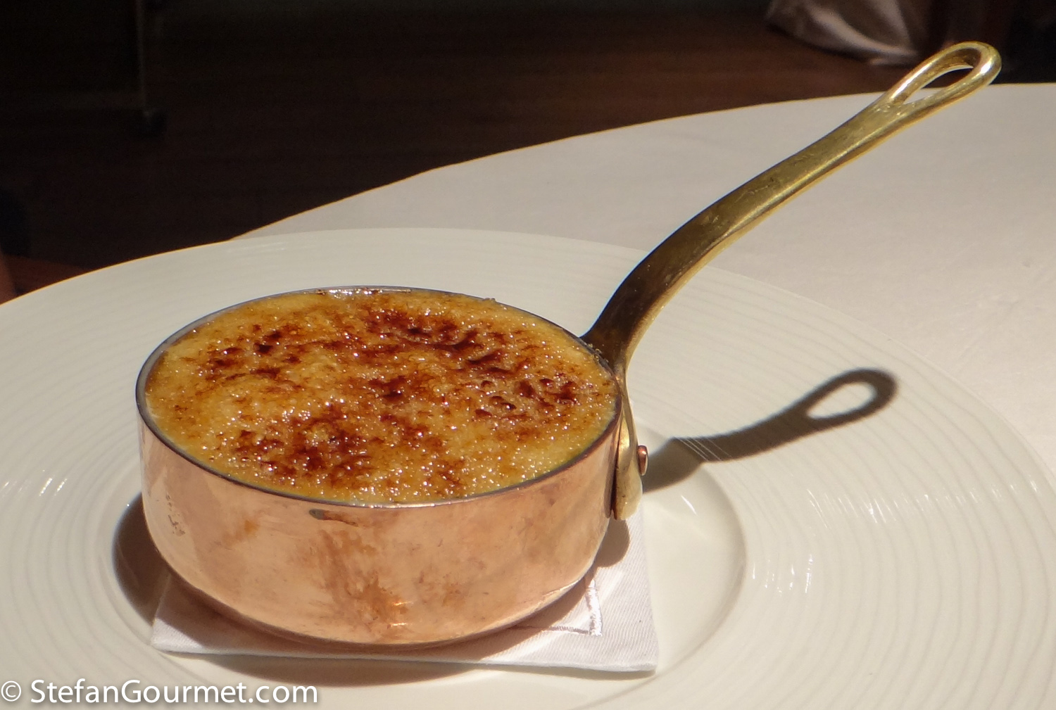 This looks like a creme brulee served in a nice copper pan, and in fact the top is like creme brulee but underneath is a very fluffy mousse with blueberries. As a dessert it is 10/10, but the wine pairing with a late harvest riesling that was hardly sweet is 0/10. The dessert is very sweet and has caramel and very ripe blueberries. Unfortunately we didn’t get a replacement for the wine until we had already finished the dessert, because I think the passito di pantelleria that was served as a replacement would have been a lot better (although not perfect).