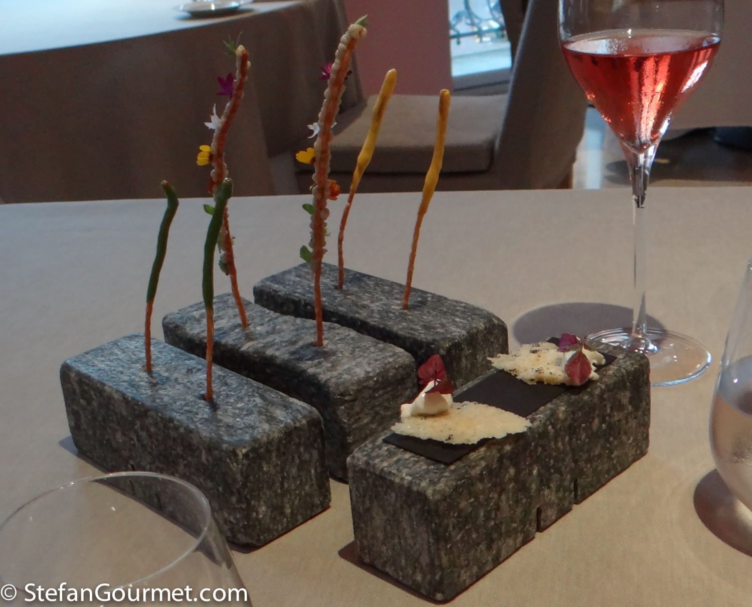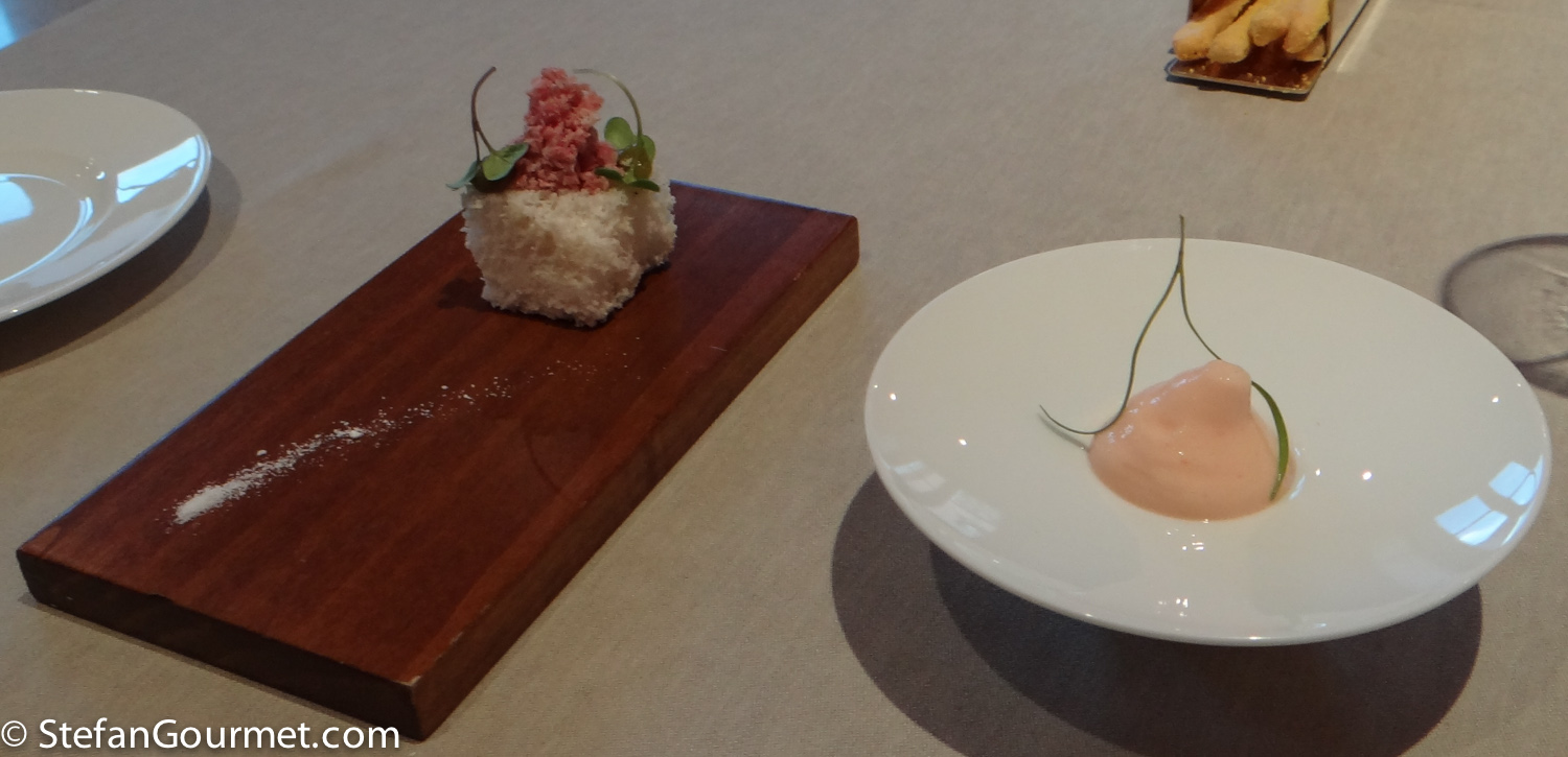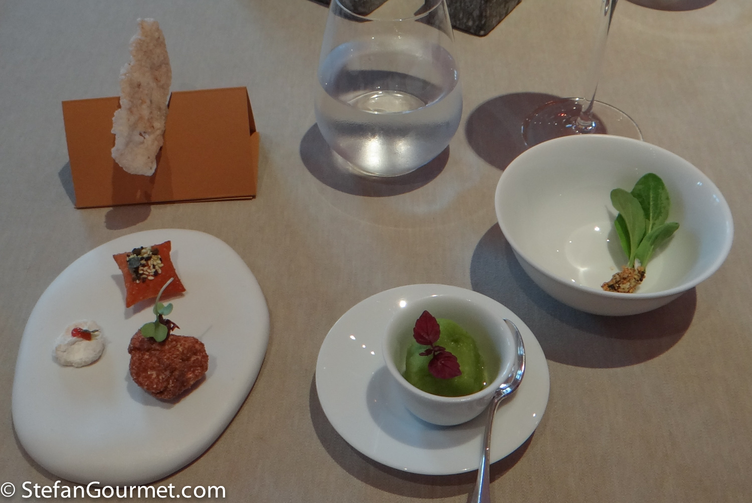 And finally mousse of foie gras and very fluffy ‘bread’ with ‘salami’. The amuse bouche are a great collection of flavors and textures, creative and delicious. 10/10