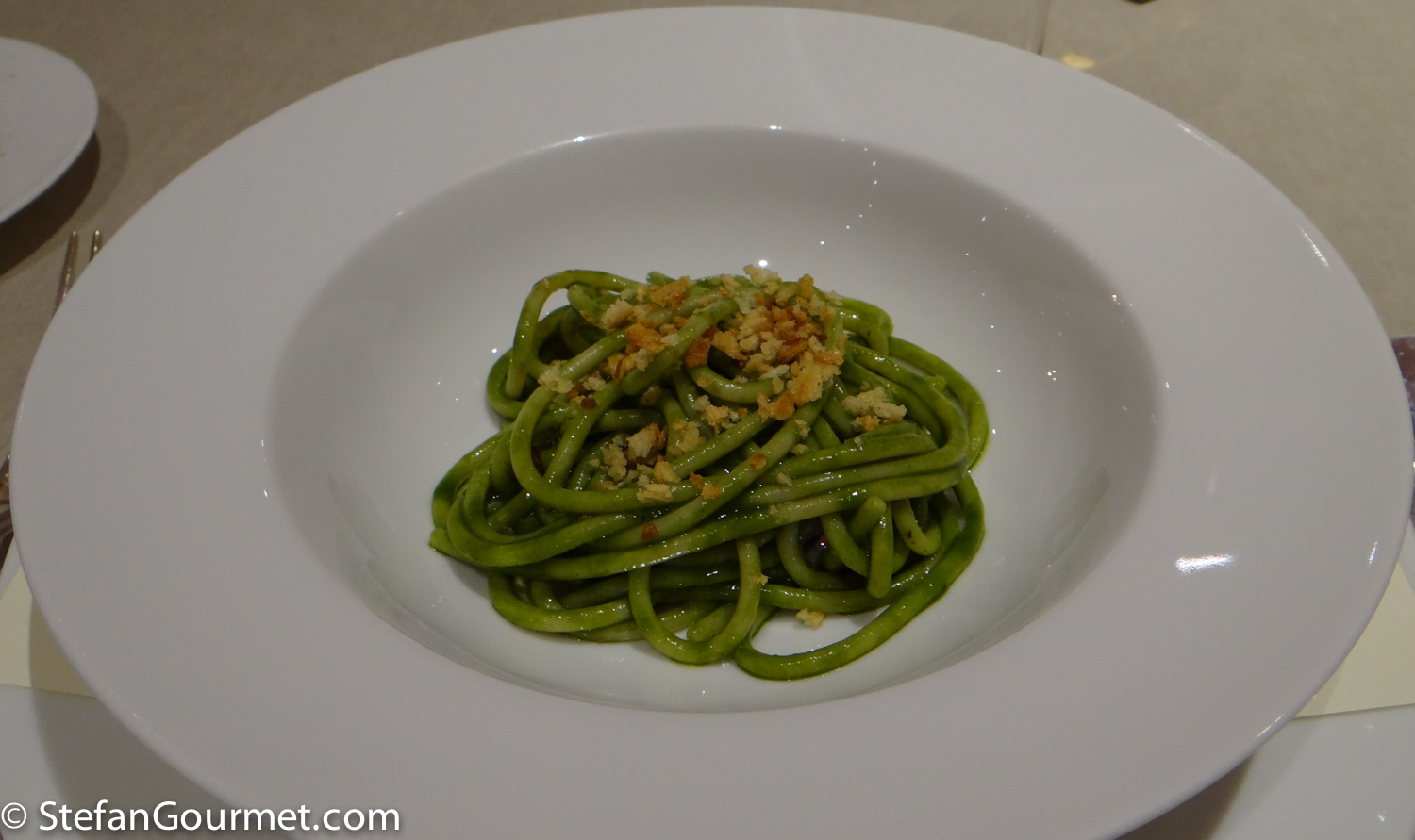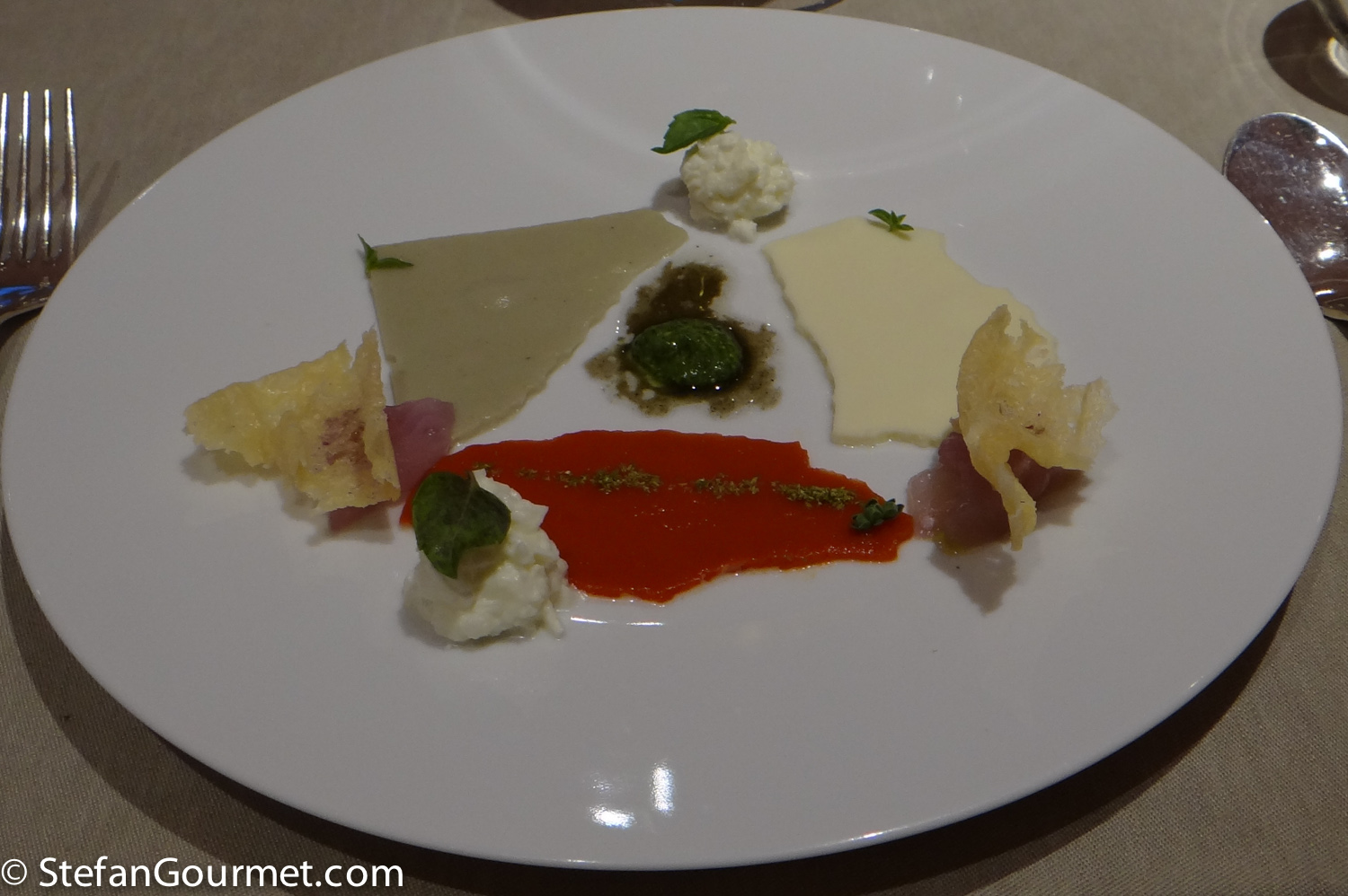 For the wine there are different percorsi on offer: 4, 5 or 6 glasses, just from Piemonte or also from ‘everywhere else’. With 6 glasses and 11 courses we could foresee a difficult wine pairing, and so we asked the sommelier to see if he could include more different wines for us. There was some misunderstanding, as what he ended up doing was giving us each a different wine in 3 of the 6 cases. This was nice, as we could sip from each other’s glasses to see which one worked better with the food.