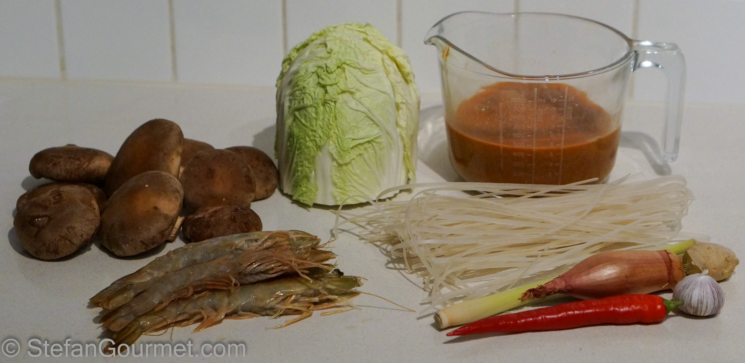 In most cases I plan what I am going to prepare for dinner and shop accordingly in advance, but for tonight I wanted to finish some leftovers I had in my fridge and created this dish. I had some Chinese cabbage (also known as Napa cabbage), shrimp stock, shrimp and shiitake mushrooms. I thought this would go nicely with some rice noodles and some Asian style seasoning: fresh chile pepper, shallot, garlic, ginger, and lemongrass. I took photos just in case it turned out well, and it did! It only needed a bit of lime juice and a bit of soy sauce, then it was delicious. The shrimp stock provides great depth of flavor and the combination of ingredients works well. Here’s what I did…