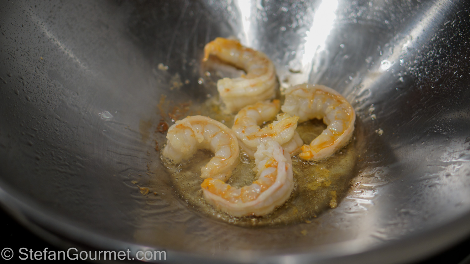 Heat the vegetable oil in a wok. Add the shrimp, cook them briefly on both sides, and remove them with a slotted spoon. Reserve.