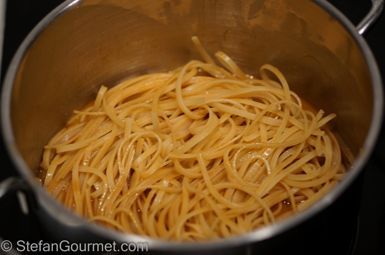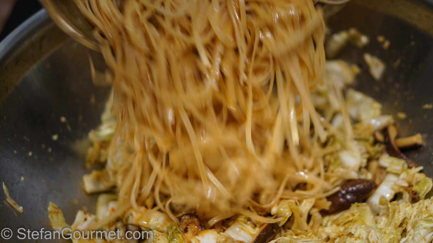 Add the rice stick noodles and allow them to soften in the hot shrimp stock.