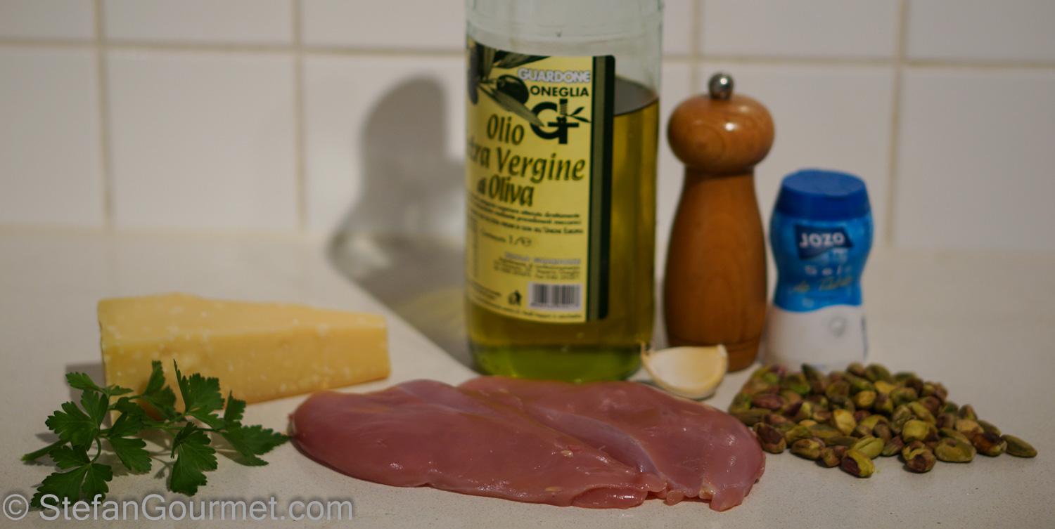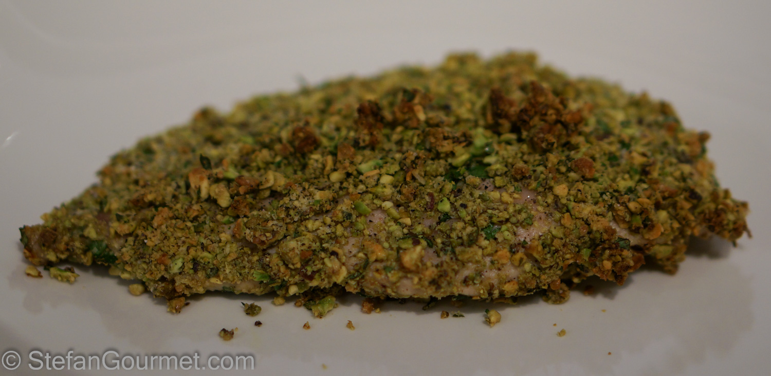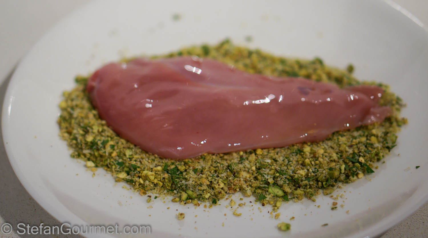 The cooking technique of Cotoletta alla Palermitana is very nice as it is light, easy, and quick. Olive oil is used instead of egg to make the crust stick to the meat, and the meat is baked in the oven for 10 minutes instead of pan-fried. The traditional version is made with chicken, breadcrumbs, capers, and olives. Today I tried breast of guinea fowl and coated it with minced pistachios. I added parmigiano, garlic, and parsley for greater depth of flavor. The pistachio crust turned out really nice and will also work with chicken or pheasant. Here’s what I did…