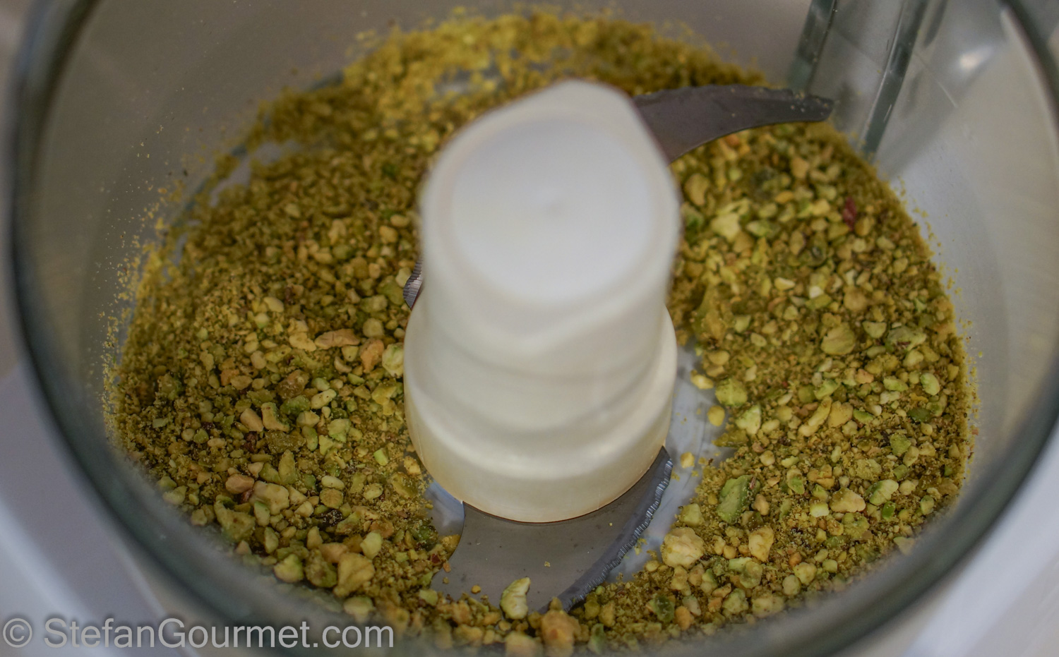 Preheat the oven to 200ºC/400ºF (fan forced). Coarsely grind the pistachios in the food processor.