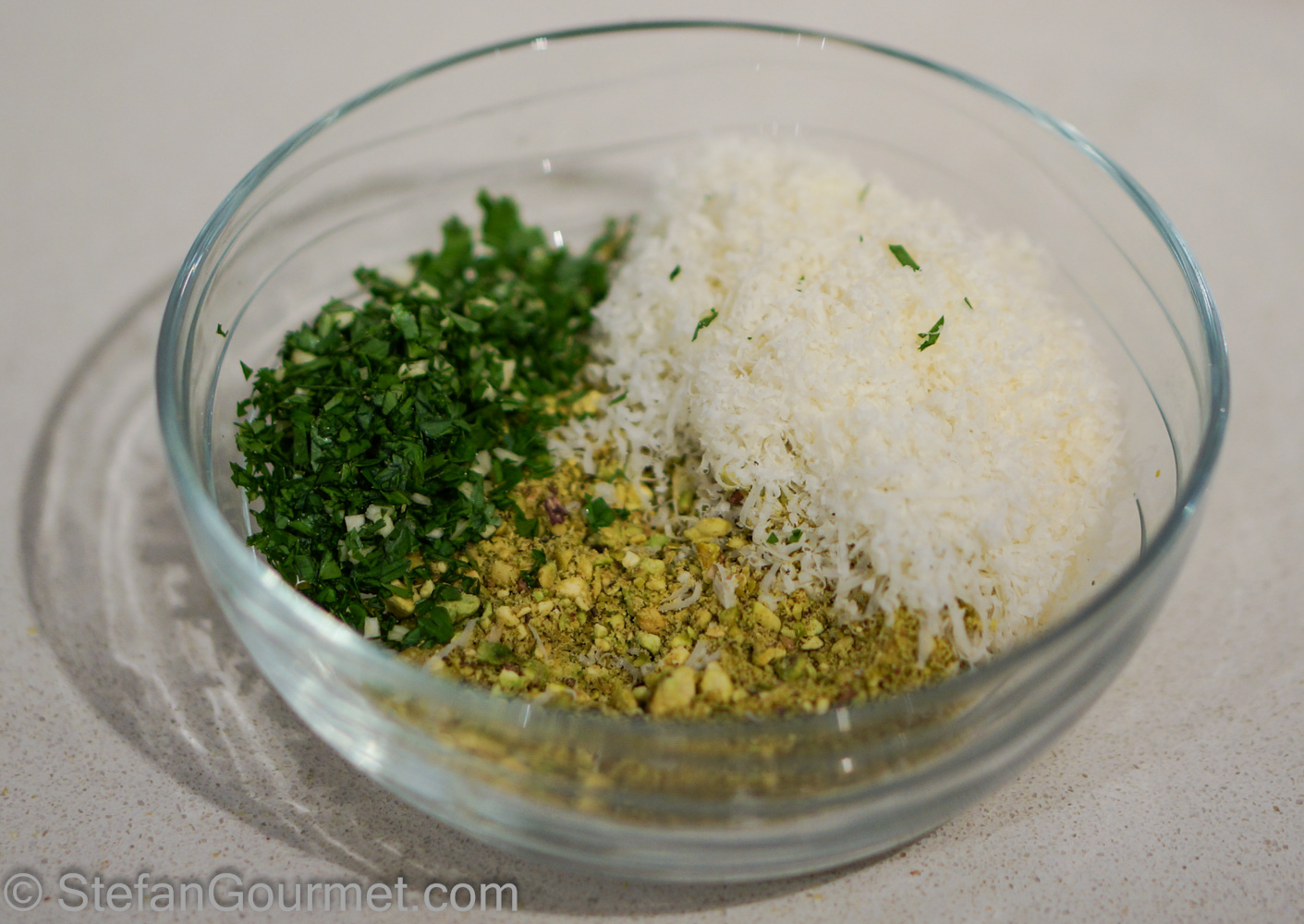 Combine the pistachios with the parsley and cheese in a small bowl and stir until homogeneous.