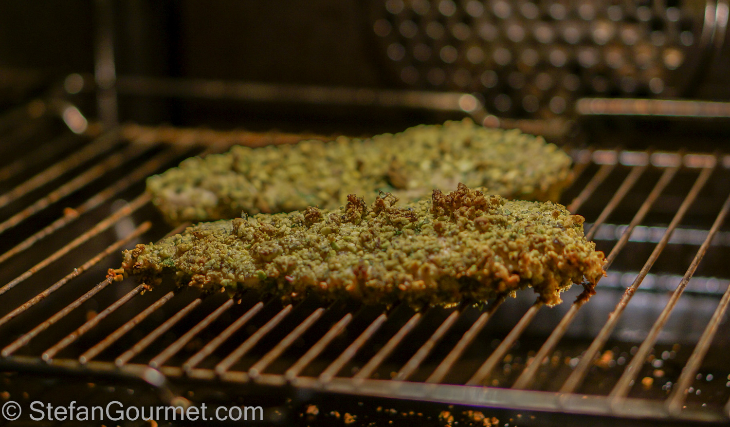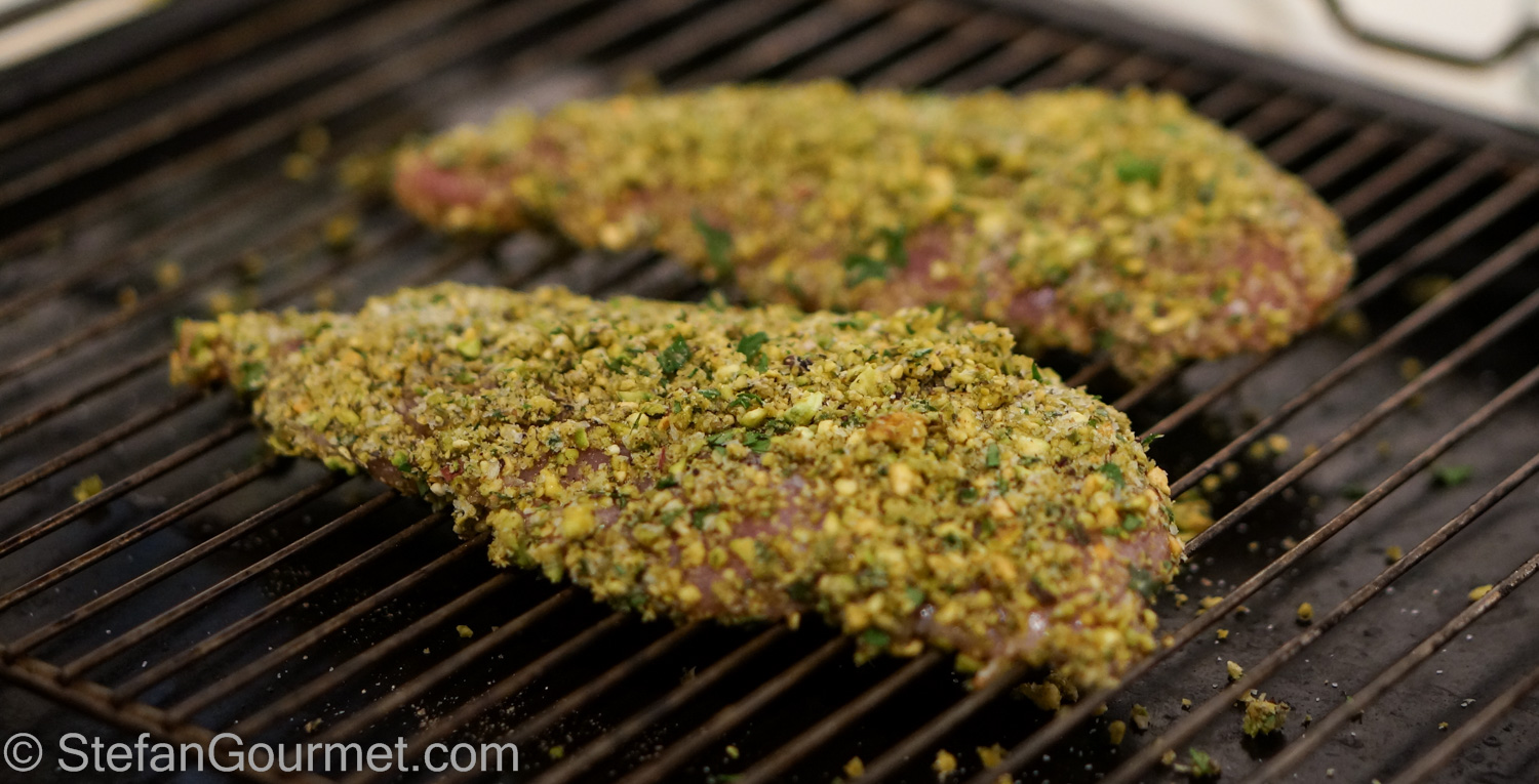Season with salt and freshly ground black pepper on both sides. Put the meat on an oven rack and sprinkle any remaining pistachio mixture on top.