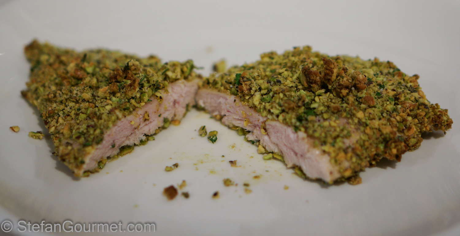 1. It will be great with either chicken or turkey — just make sure that it is about 1/4 inch to 1/3 inch thick so it will cook within the 10 minutes needed to toast the pistachios.