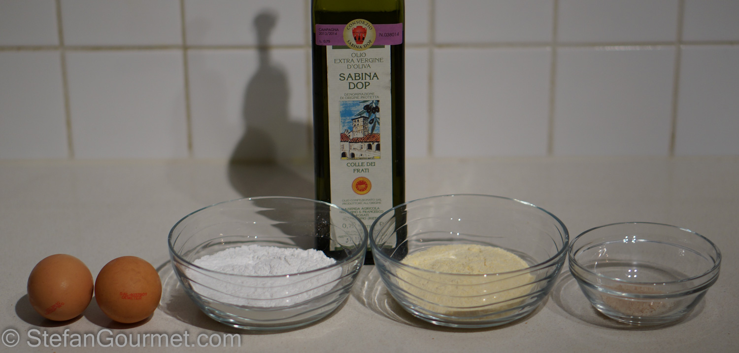 I tried to make the second mixture lighter in flavor and texture by replacing the polenta with wholemeal rice flour. This recipe was 1 egg, 2 egg yolks, 75 grams white rice flour, 75 grams full rice flour, 1 tsp extra virgin olive oil, 1 Tbsp of psyllium husk, and water as needed.