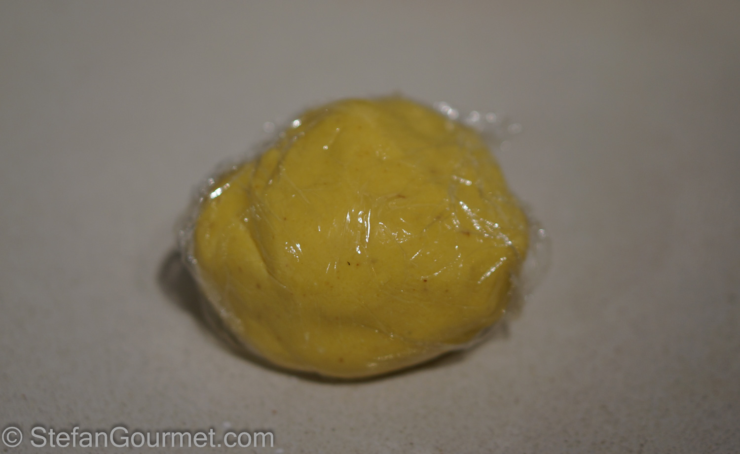 Wrap the dough in plastic wrap and allow to rest for half an hour. This will allow the flour to fully absorb the water.