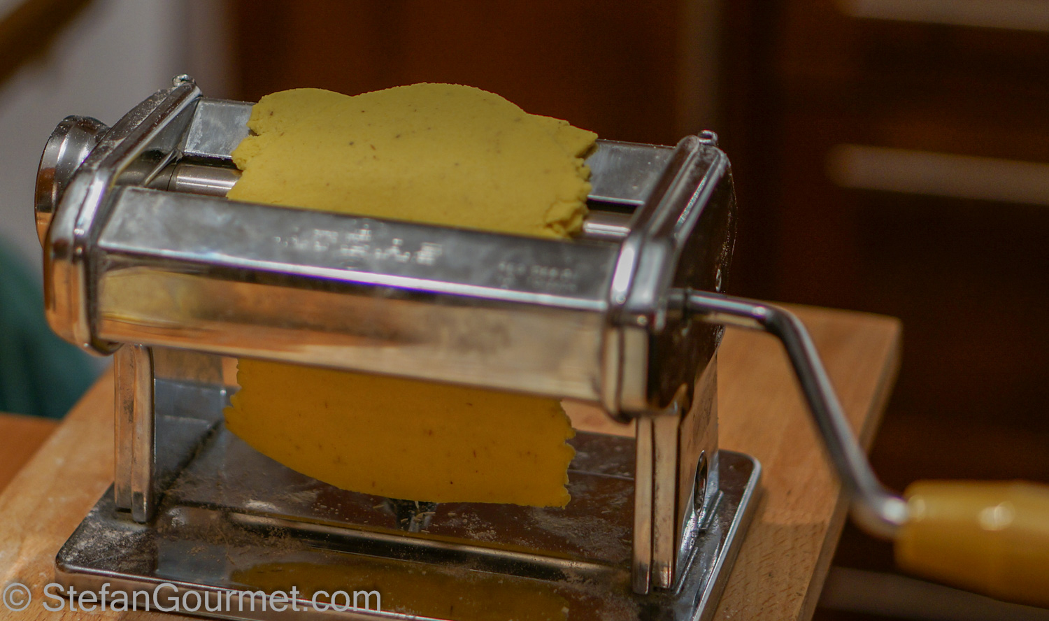 On my Atlas/Marcato pasta machine with setting 1 as the widest and 9 as the thinnest, I could only go down to setting 6. (With regular pasta dough with gluten I go all the way down to 9 when I make ravioli.) As you can see, the edge of the sheet of dough is more ragged and not as smooth as with regular pasta dough.