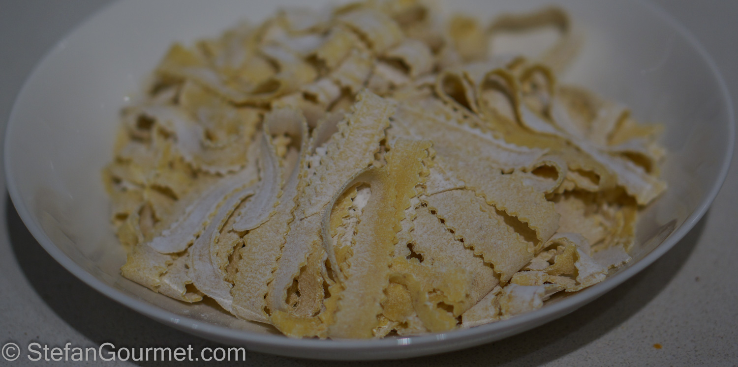 This may sound like stating the obvious, but when I worked with gluten free dough it really dawned on me what it means that it does not contain gluten. I could knead the gluten free pasta dough for as long as it wanted, but it never became elastic. After trying three different gluten free mixes for pasta dough, my conclusion is that it is not difficult to make homemade fresh gluten free pasta dough, as long as you don’t expect it to behave (or to taste) like regular pasta dough. It won’t be as strong, it won’t be as elastic, and it will have a different flavor. You have to handle it more carefully, as it will break more easily. But it certainly is possible to make delicious gluten free homemade fresh pasta dishes!
