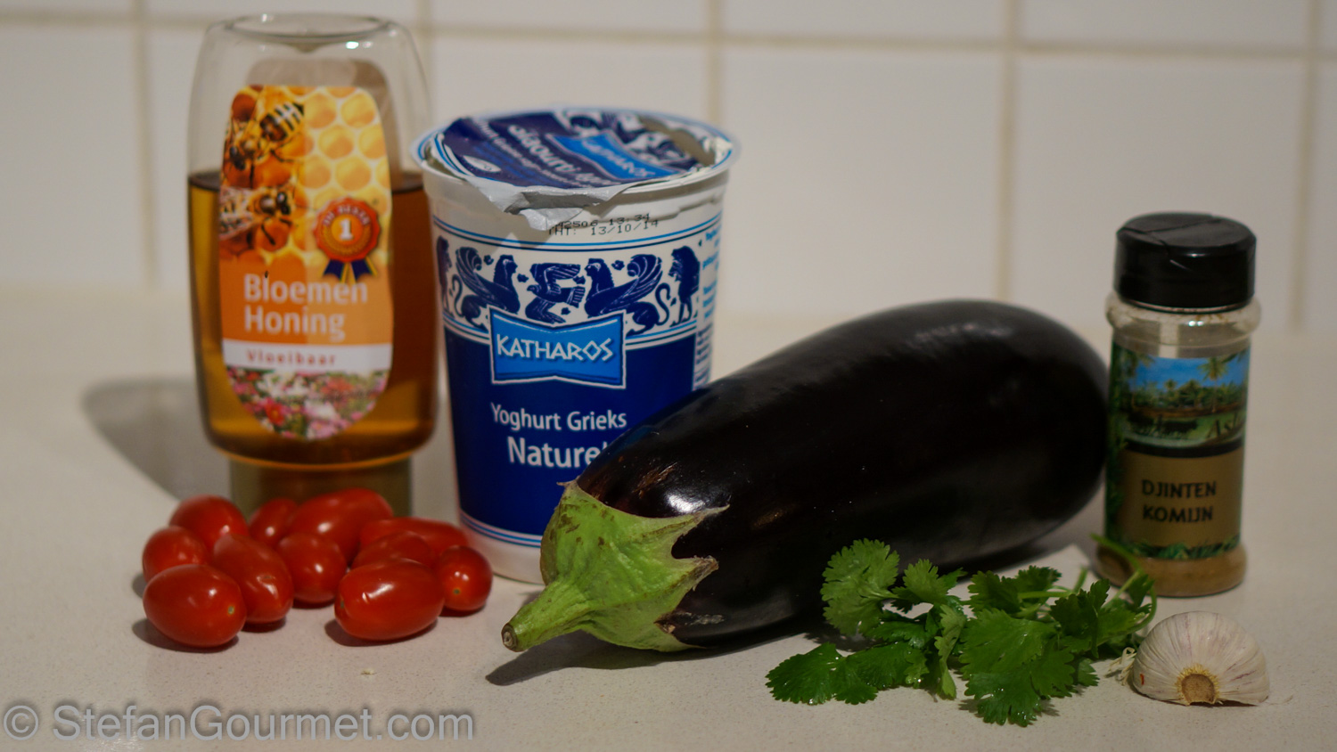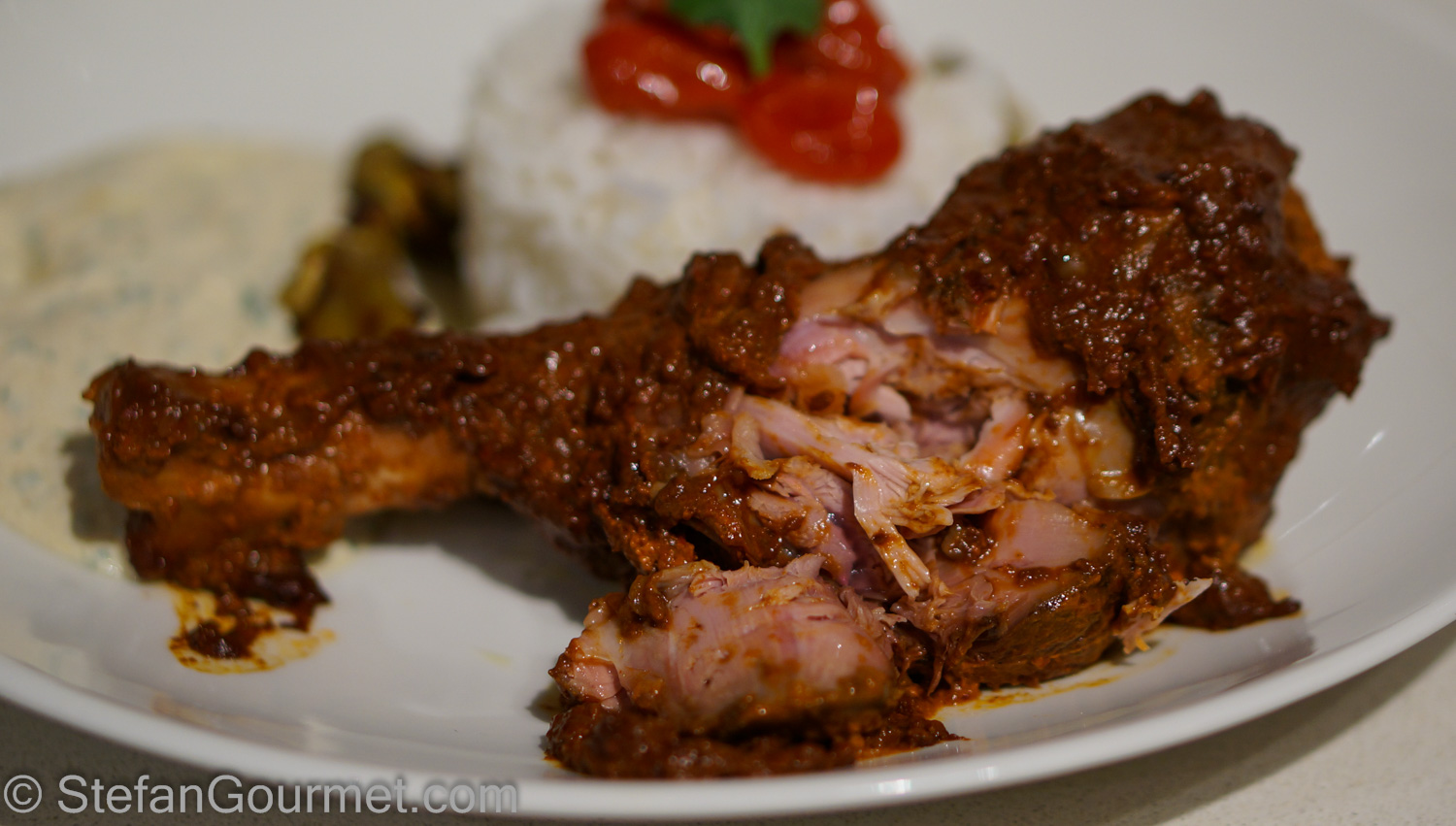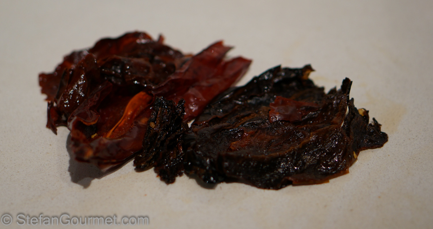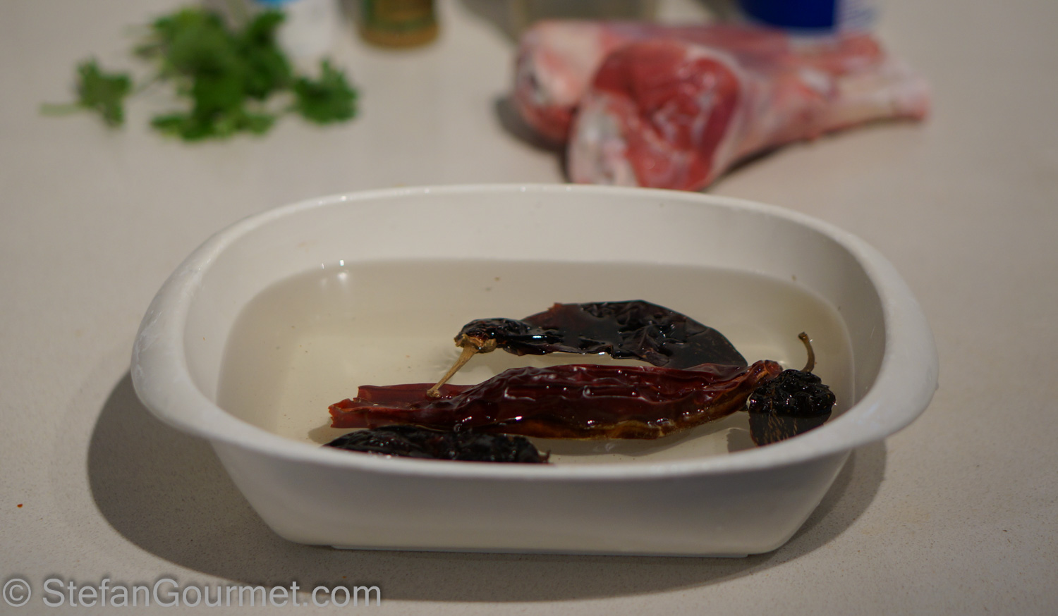 Lamb shanks are amazing when cooked sous-vide for 48 hours at 62ºC/144ºF. They are pink, juicy, and very tender. This recipe will work when cooked in the oven, but the shanks will have a traditional braised texture. (Instructions for cooking in the oven are included in the recipe.) This time around, I remembered to take a photo of the inside so you can see for yourself how pink it is. After preparing lamb shanks plain with just a bit of thyme as well as in a delicious Italian sauce and served with asparagus, I thought it would be nice to create something completely different. First I marinated and then cooked the lamb in a sauce made with various dried chile peppers (a kind gift from REMCooks, by now replenished by my own purchases), and then I served it with roasted eggplant, a delicious yogurt sauce, and rice. I had some cherry tomatoes that I roasted along with the eggplant. They looked nice on the rice, but didn’t really add anything to the rest of the dish. The combination of the earthy peppers with just a tiny bit of heat and smokiness and the freshness of the yogurt sauce was marvelous. If you like more heat, use hotter types of chiles such as New Mexico Extra Hot or Pasilla Negro. Although of course this dish requires some planning because of the 48-hour cooking time, it is not a lot of work at all and relatively easy to make. Here’s what I did — please note that not all of the ingredients are shown in the ingredient shots as I was making this up along the way…
