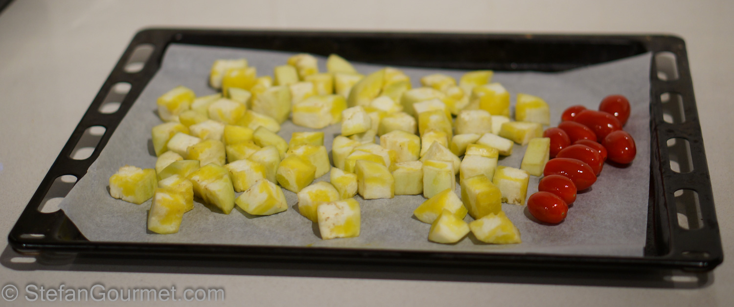 About 45 minutes before you would like to serve, preheat the oven to 225ºC/450ºF. Cut the eggplant into cubes (peeling the eggplant first is optional). Toss the eggplant with the olive oil. Arrange the eggplant on a baking sheet lined with parchment paper.