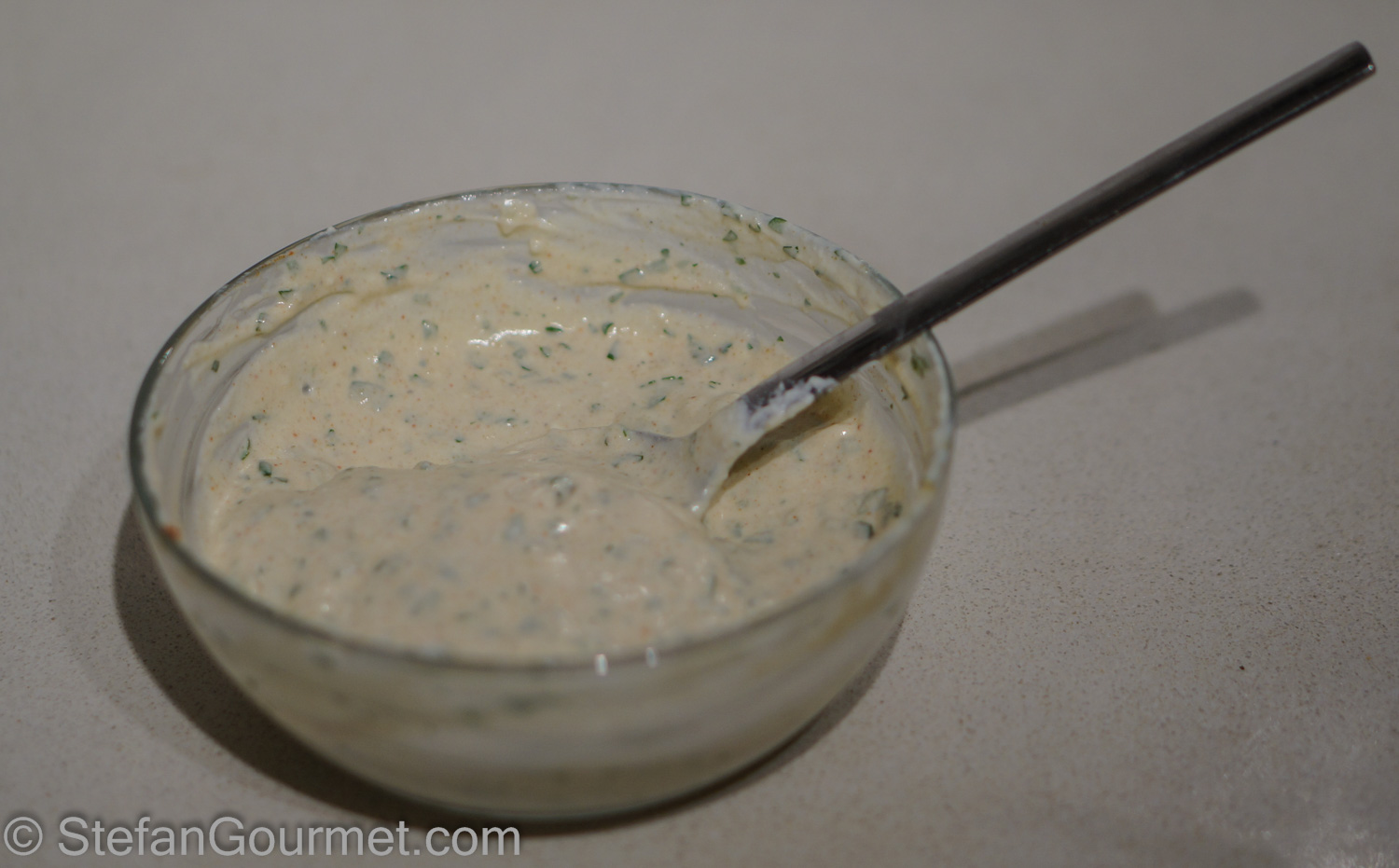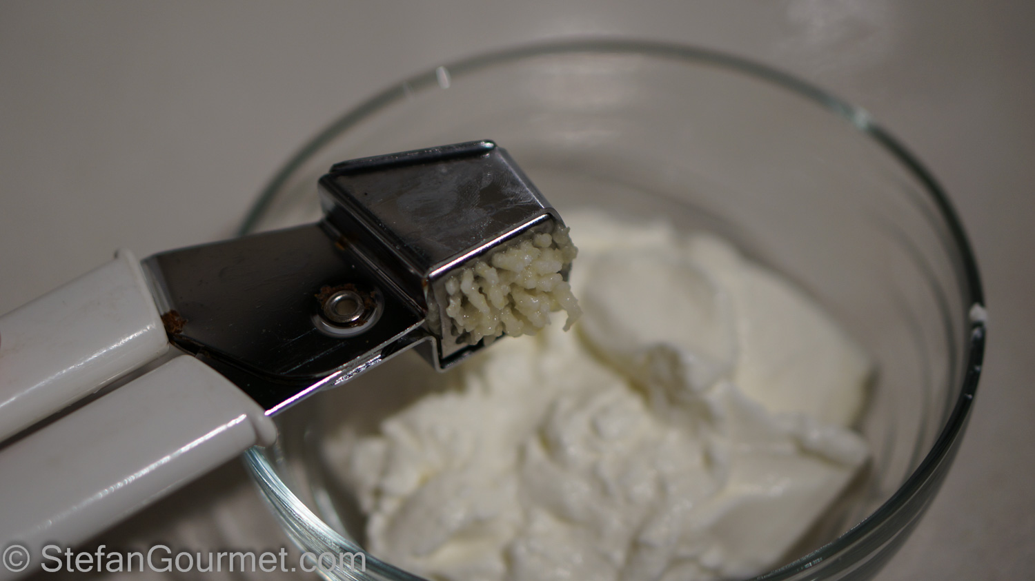 Meanwhile, prepare the yogurt sauce. Put the yogurt in a bowl. Crush the garlic and add it to the yogurt.