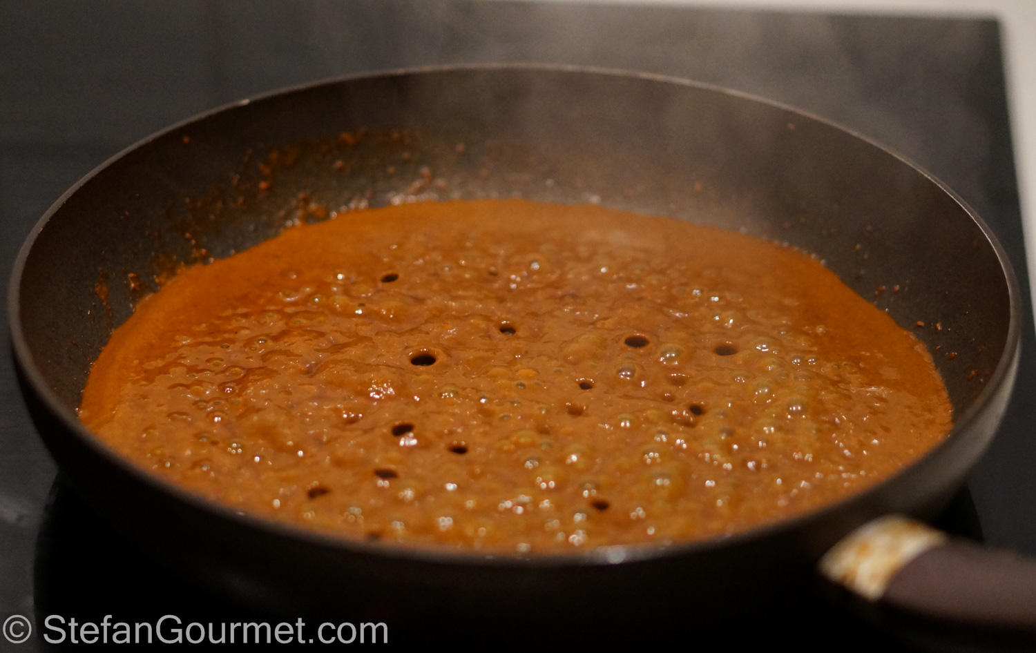 Set the lamb shanks aside and put the sauce in a non-stick pan. Bring it to a boil and reduce it over medium heat until it is no longer watery.