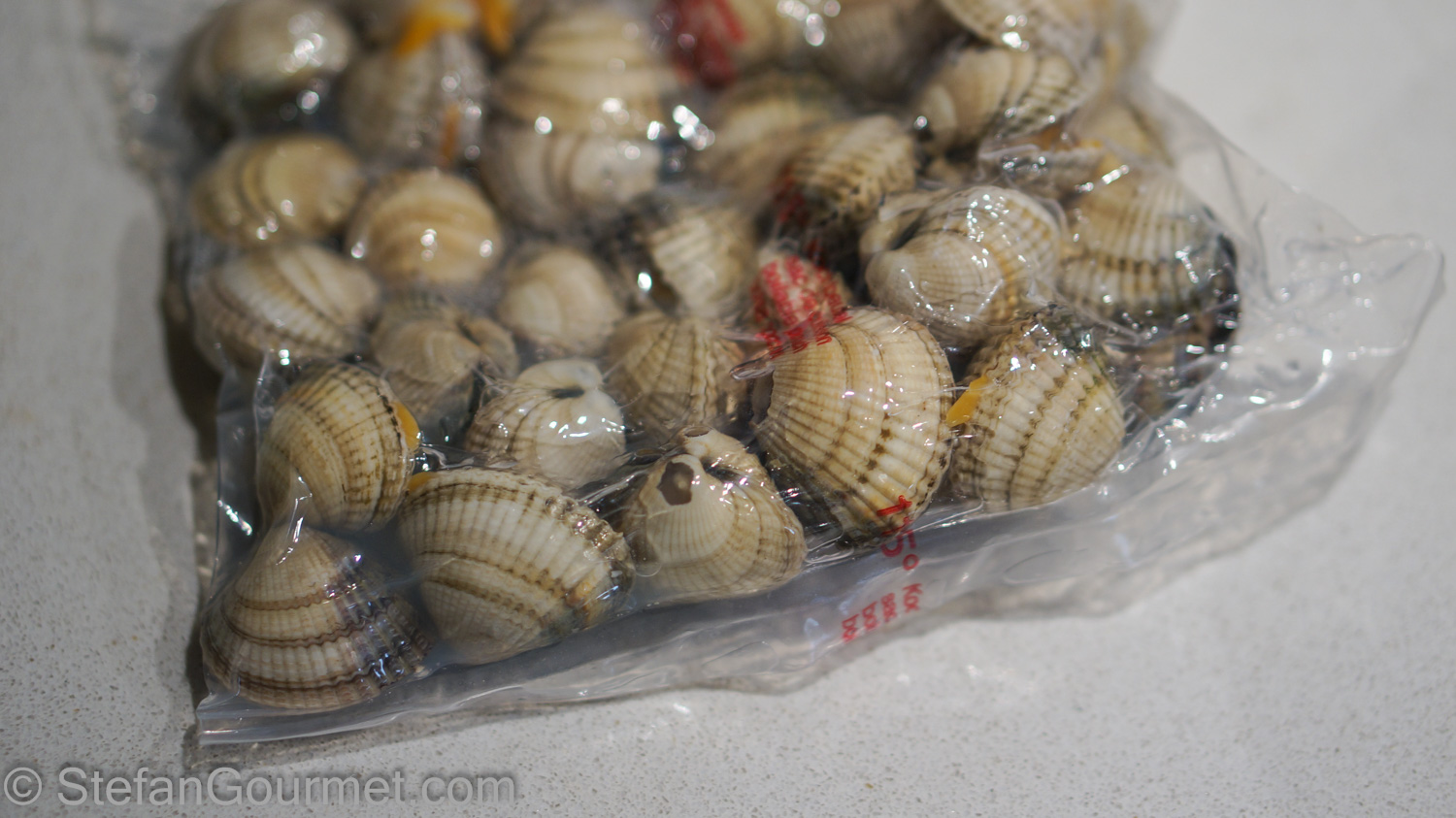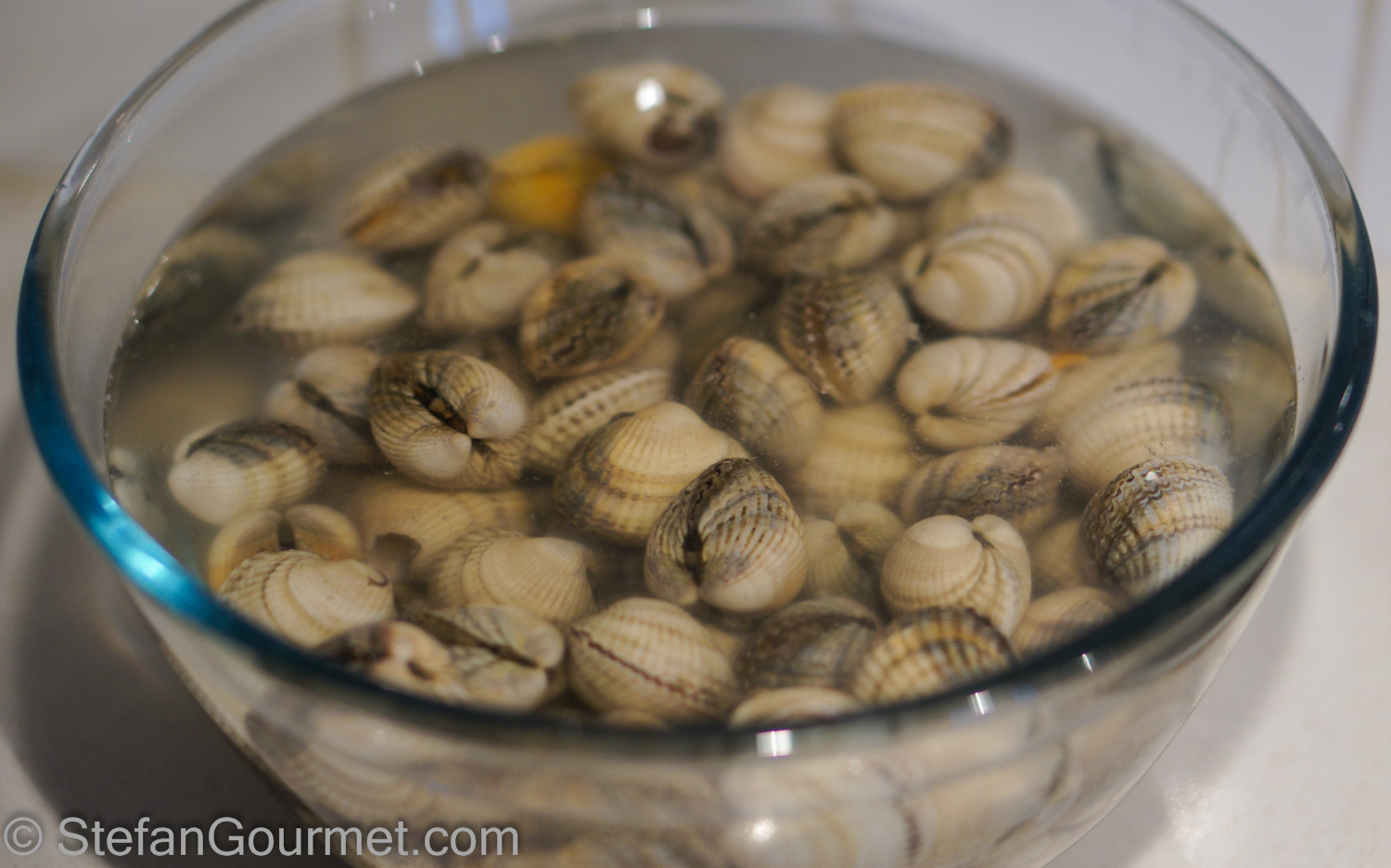 Put the clams in a litre (4 cups) of water with 30 grams (4 tsp) salt, which is as salty as the sea and will invite the clams to purge themselves. After an hour, rinse the clams with cold water to remove the salt.