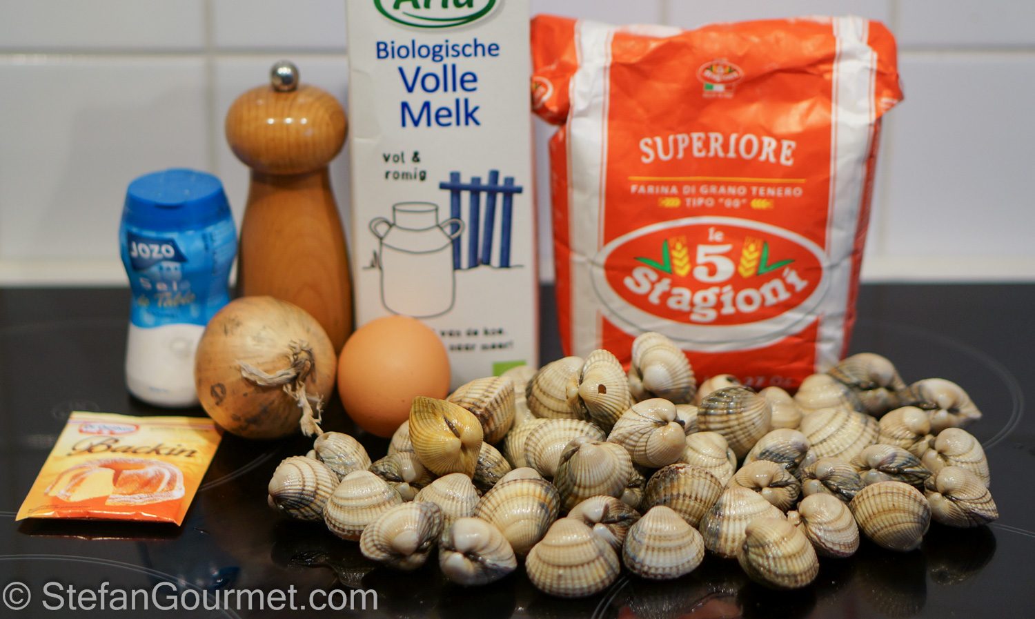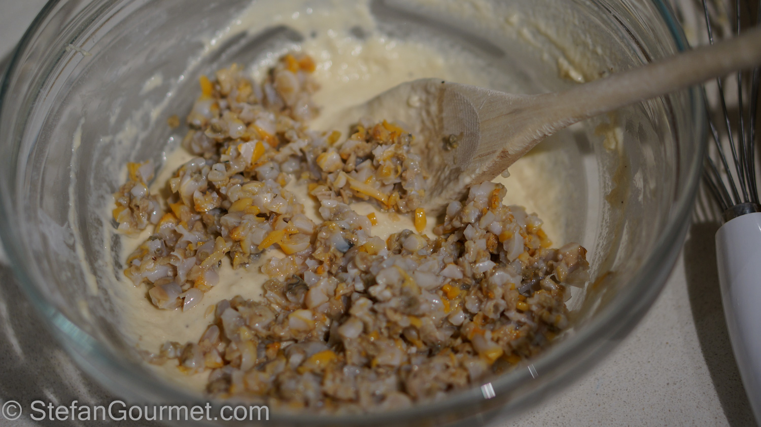 Clams were on sale (only 6 euros per kilo or US$ 3.50 per lb), which was a good reason to make clam cakes. They originate in New England and are also called clam fritters. Chopped clams are mixed with a batter of flour, eggs, clam juice, milk, baking powder, salt, and pepper. Some recipes also include minced onion or shallots. The local clams in New England are quahog or hard clams, but you can also make them from other clams such as cockles or vongole. In the Florida Keys they are made using conch and called conch fritters.