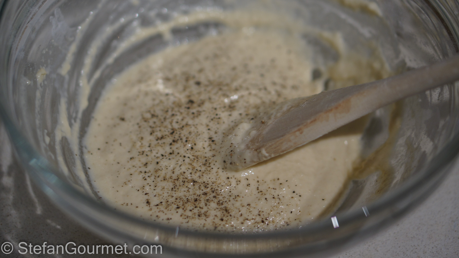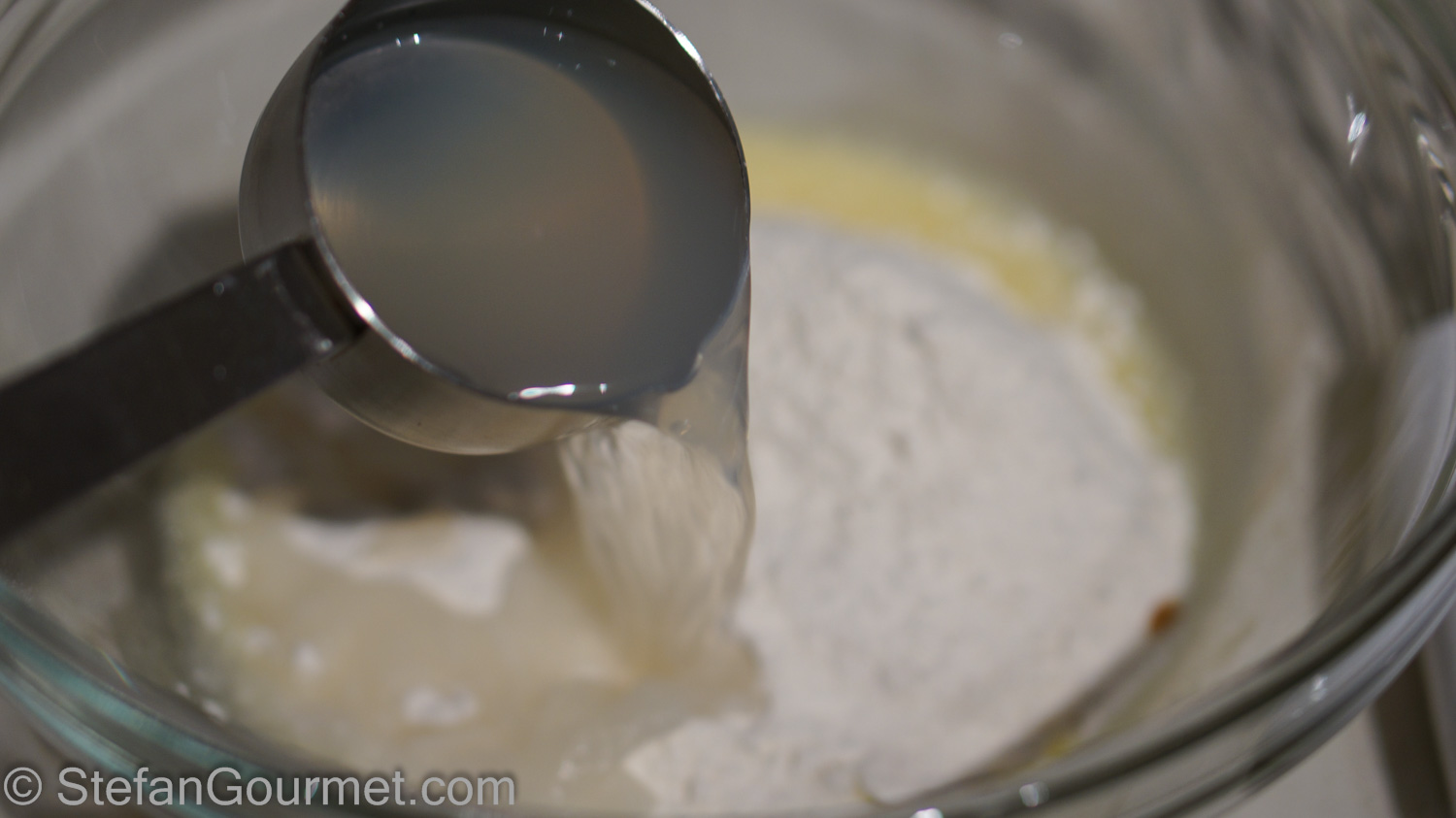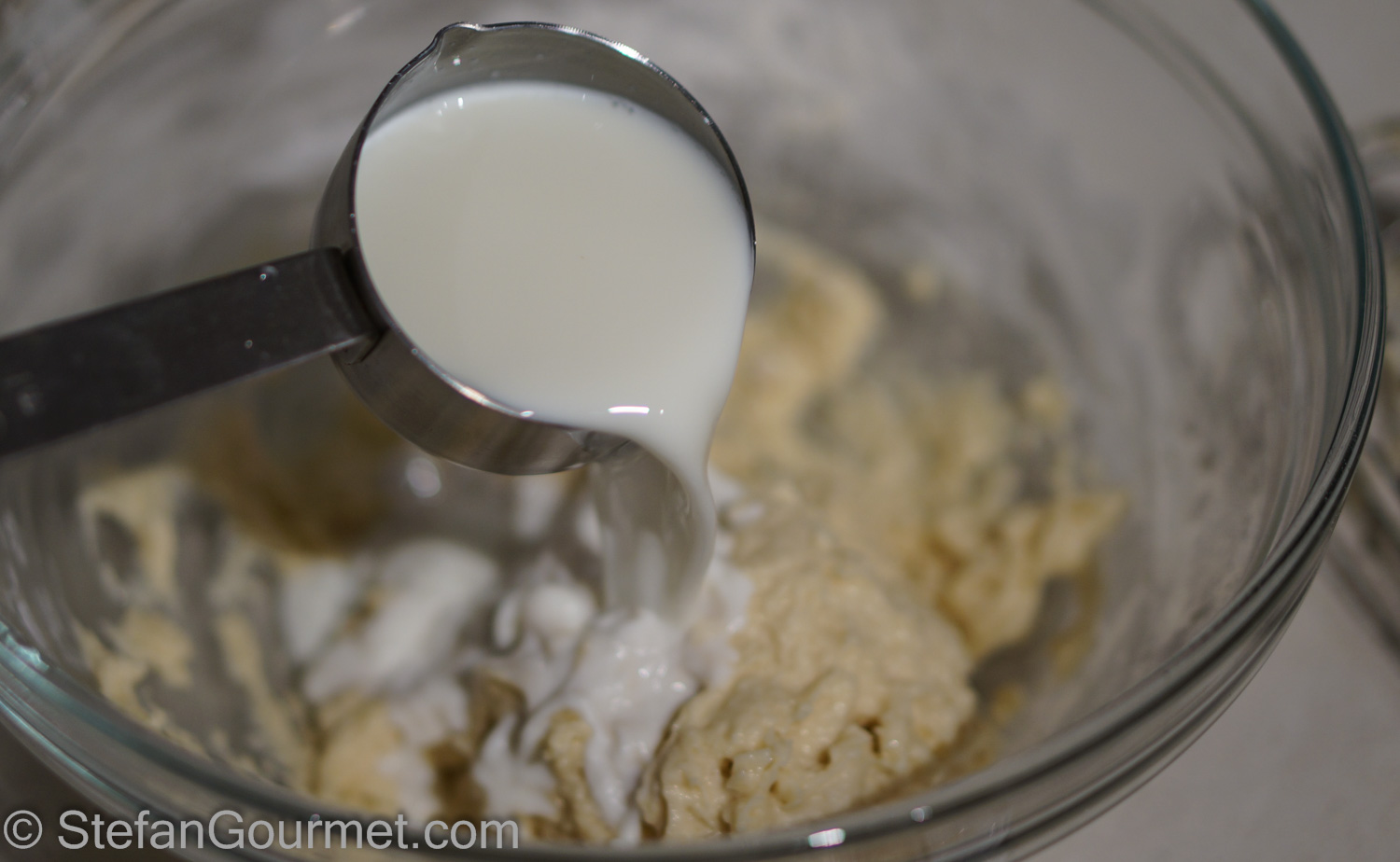 Add the milk slowly and keep stirring. Not adding all the liquid at once helps to prevent lumps. Keep adding milk until you have a thick batter.