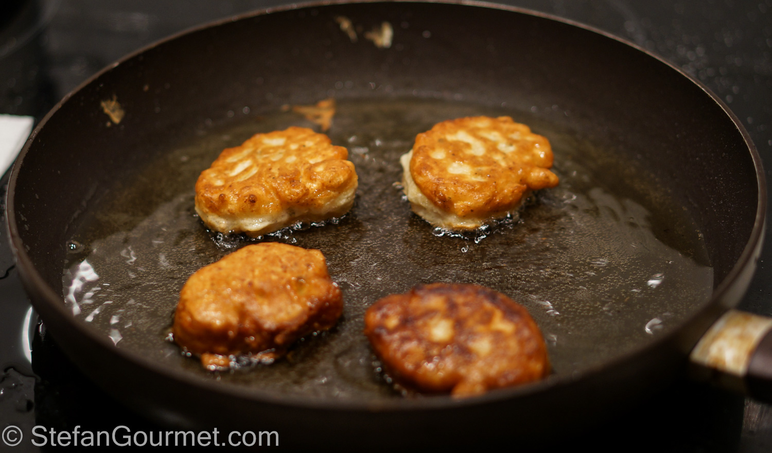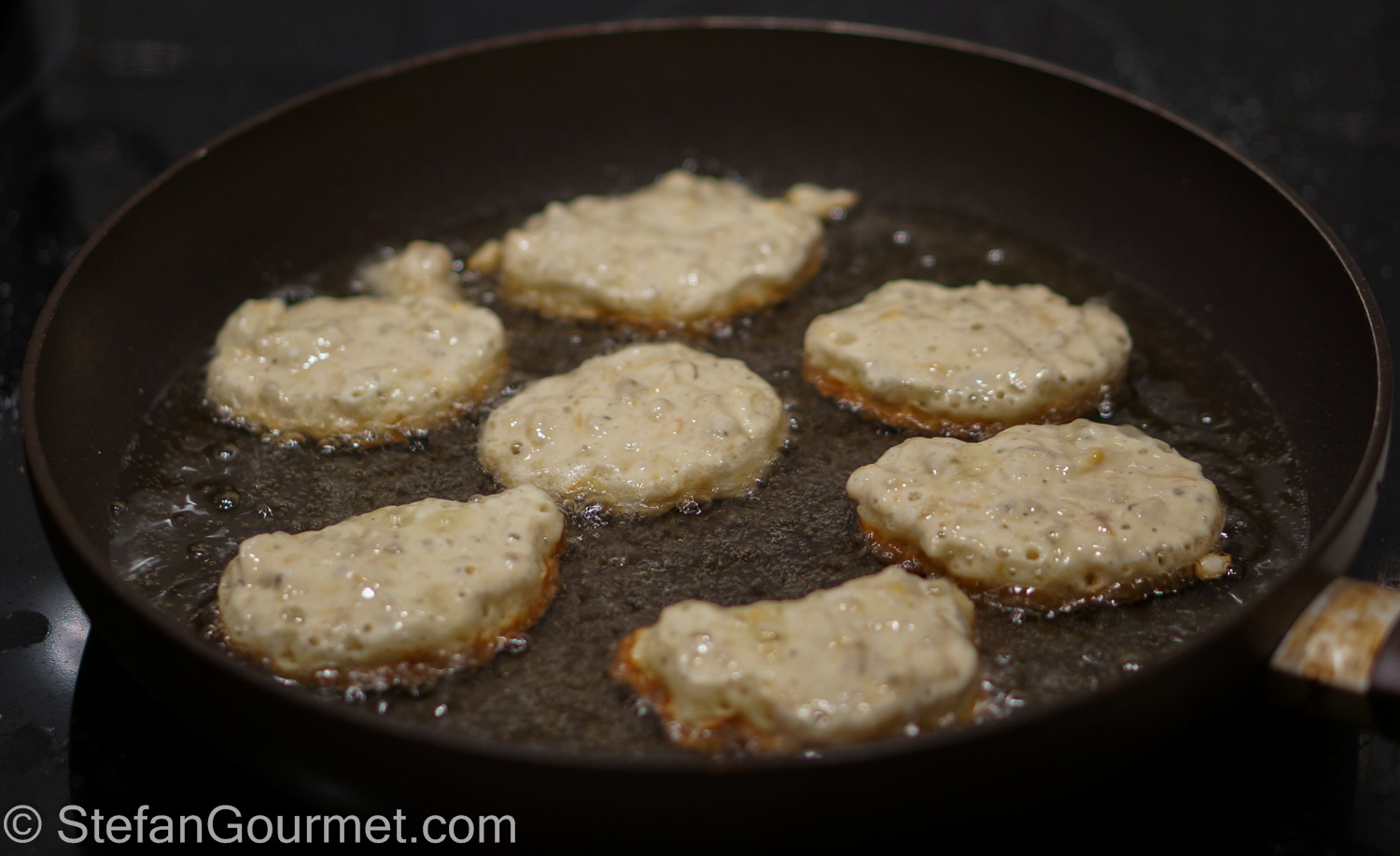 Heat up about 1/2 cm (1/4 inch) of vegetable oil in a non-stick frying pan, or 2 litres (2 quarts) of vegetable oil in a deep fryer. The oil should be about 160ºC/320ºF. Gently lower tablespoons of batter into the hot oil.
