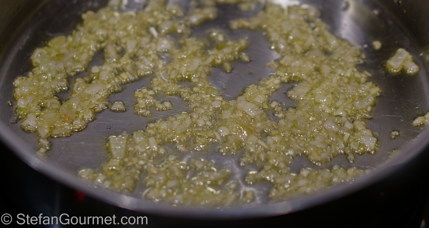 Sauté the shallot in the olive oil in a thick-bottomed wide shallow pan over low heat until it is soft and fragrant.