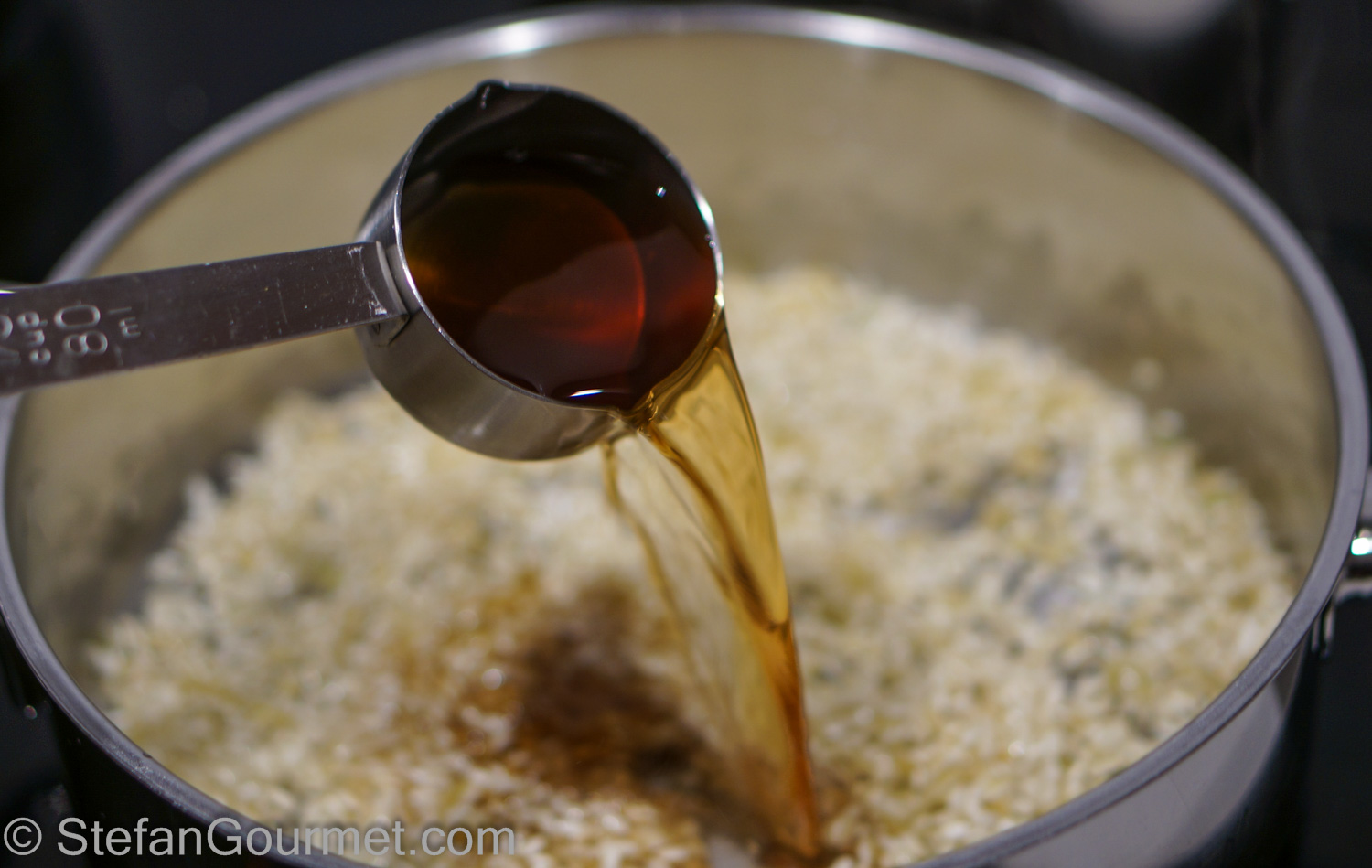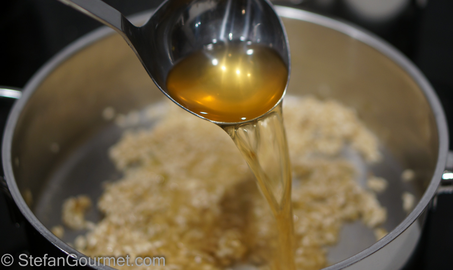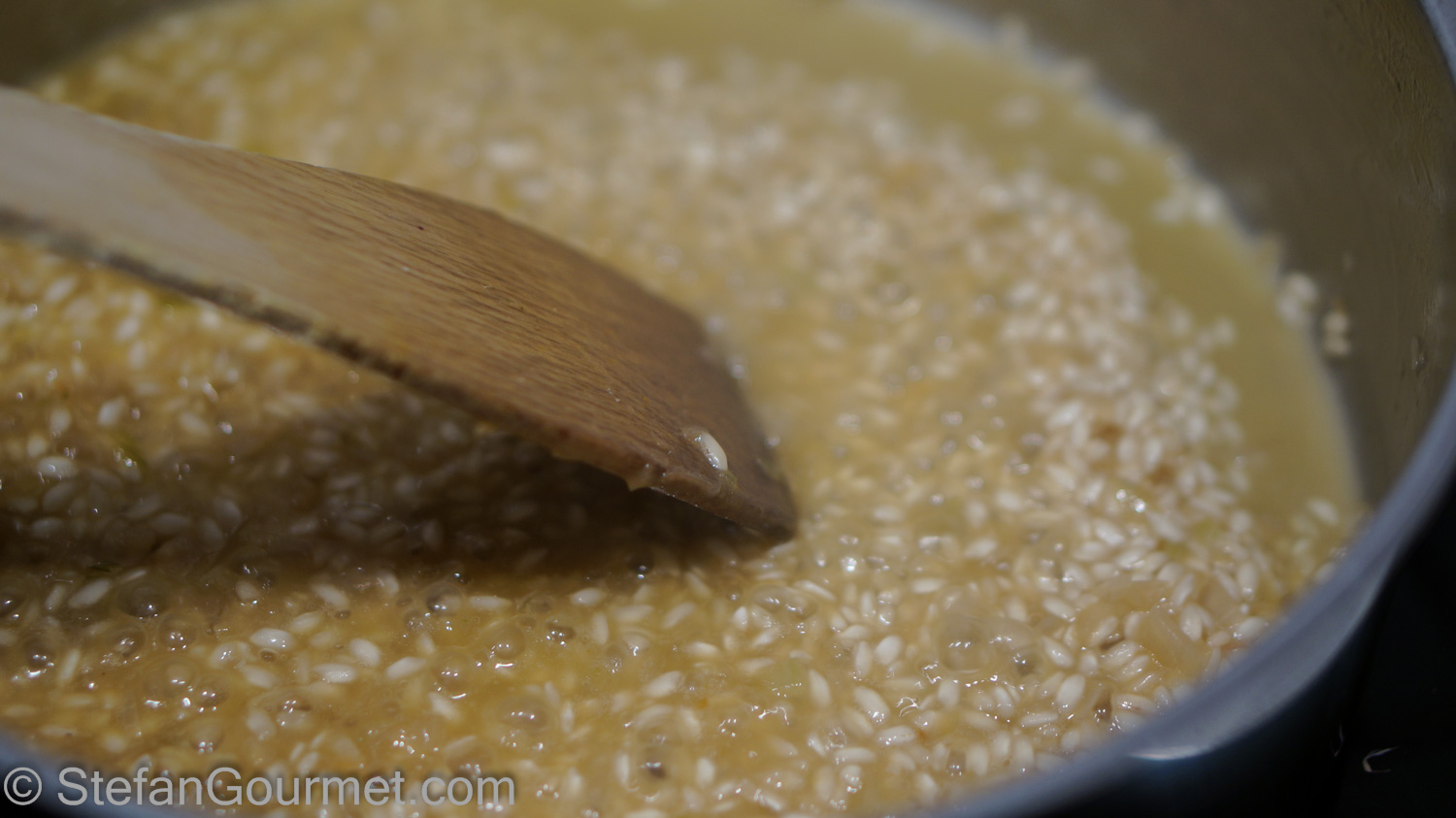 Stir until the stock has been absorbed. Then add another ladle of stock. Keep adding stock and stirring.