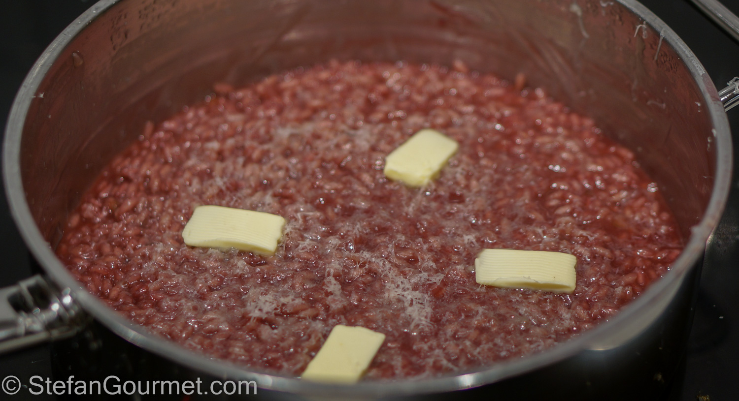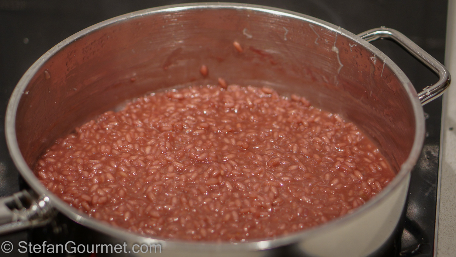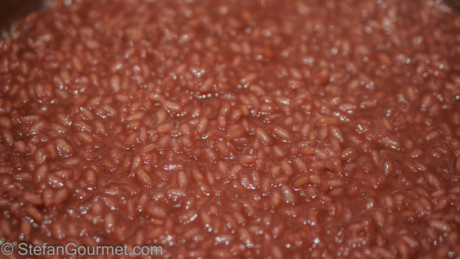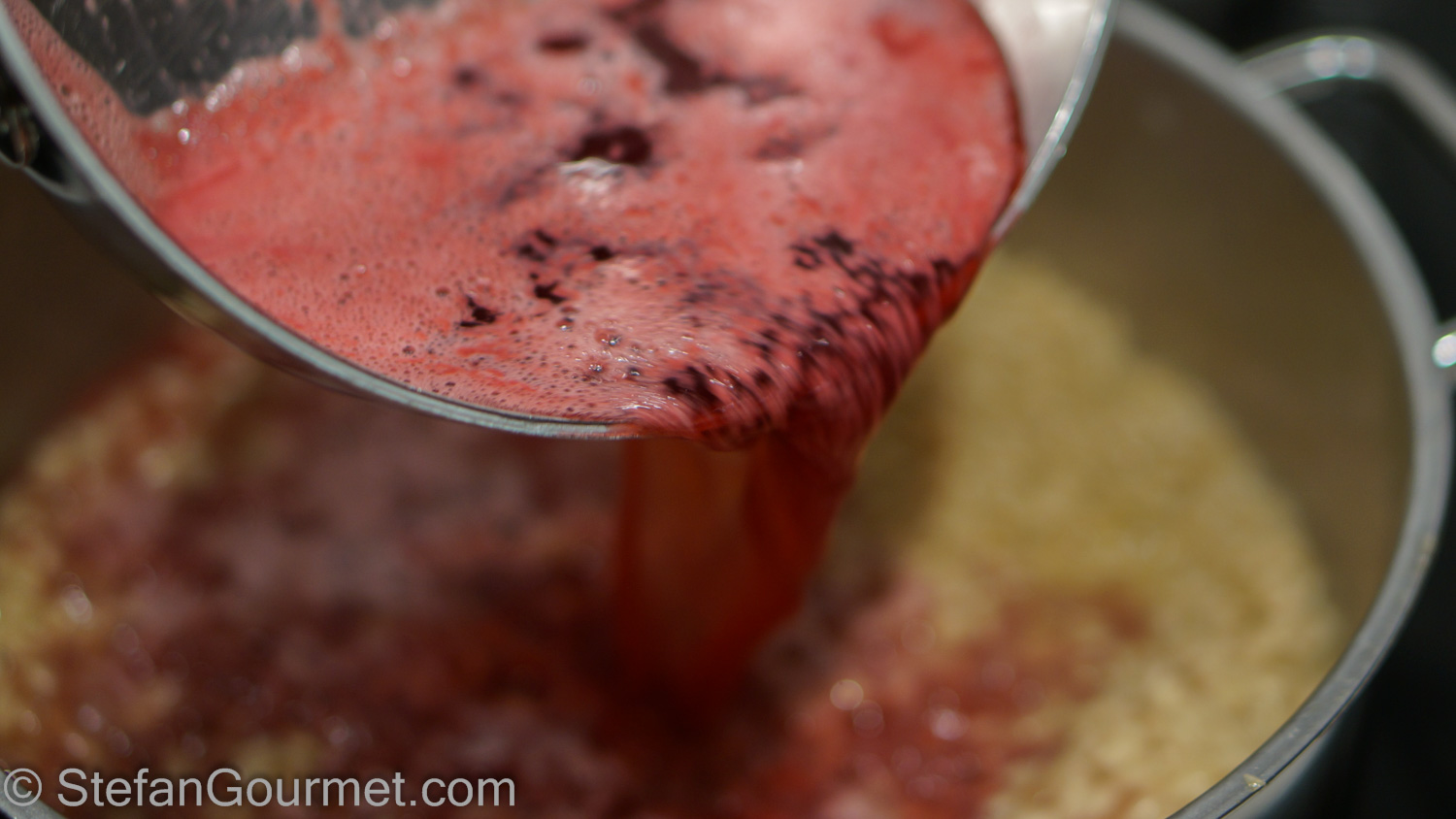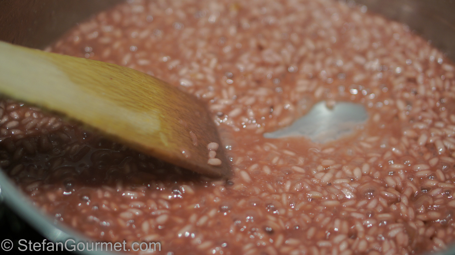 Keep stirring the rice, and once the pomegranate juice has been absorbed return to adding stock. Keep stirring and adding stock until the rice is cooked to your liking, about 18 minutes total cooking time.