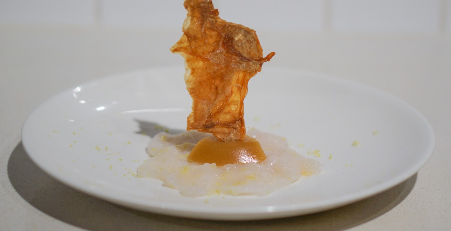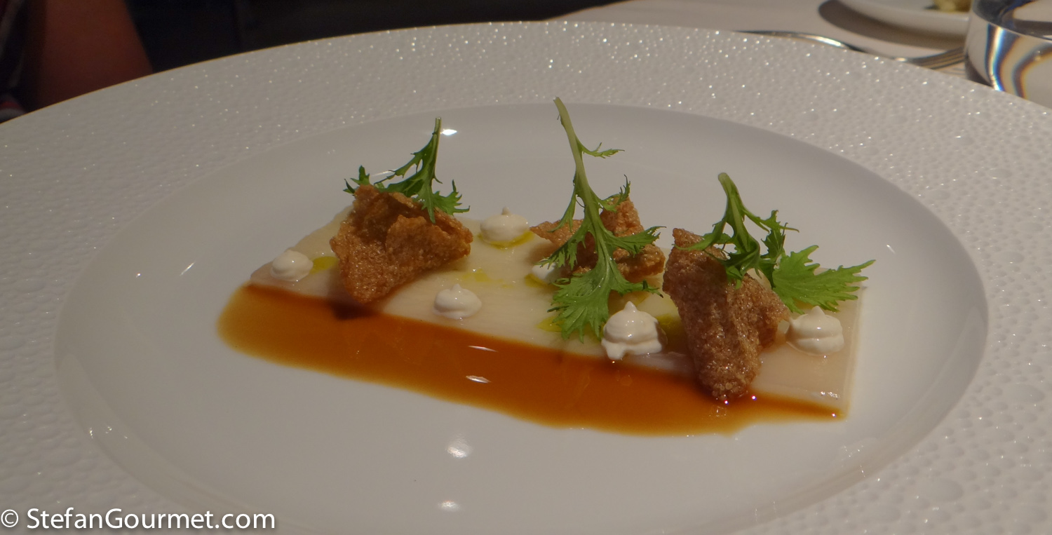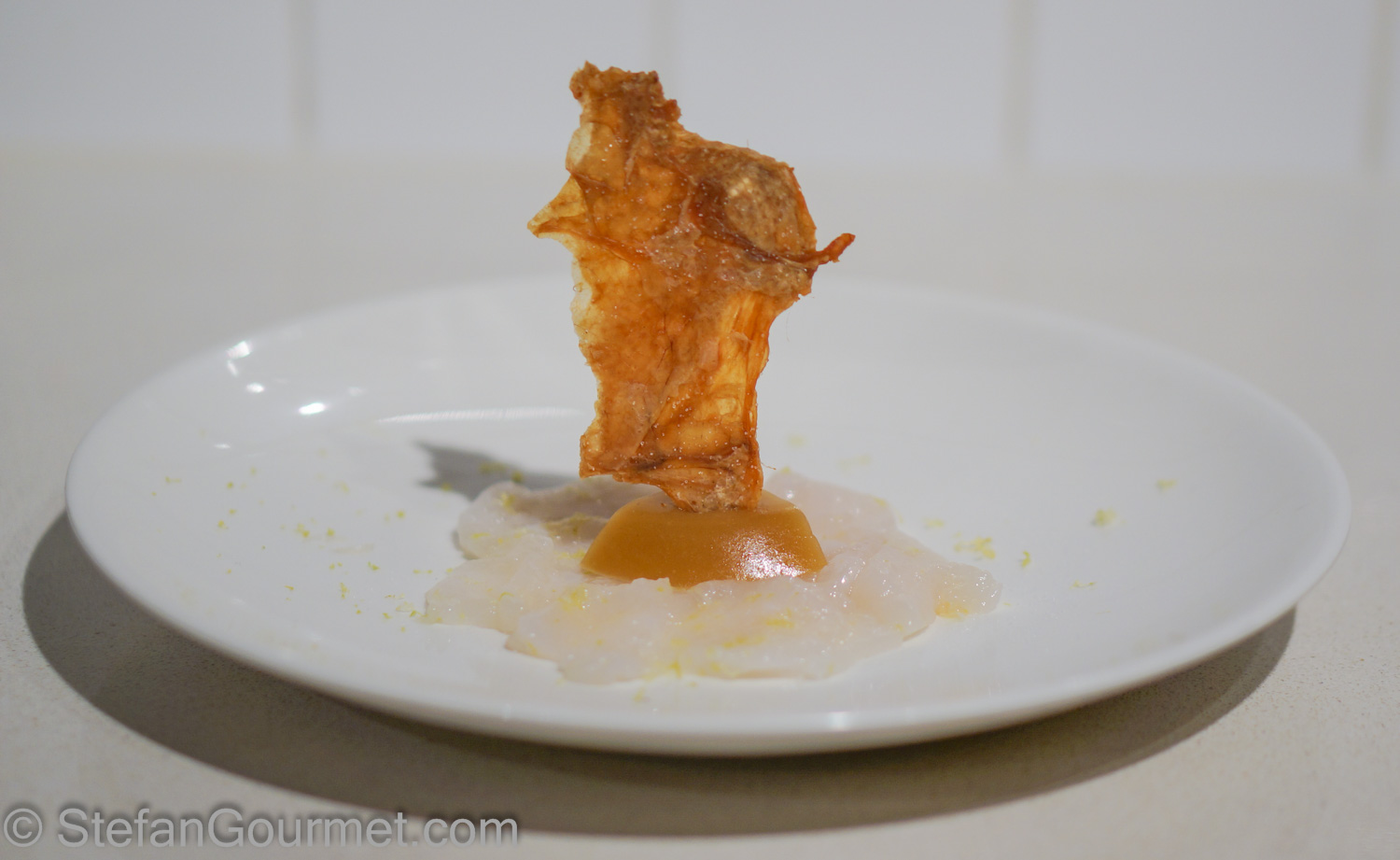 This was what the dish at Devero looked like and what I wrote about it in my review: “Scallops with yuzu and chicken may sound like a weird combination, but it is very tasty indeed and one of the best of the evening thanks to the outstanding wine pairing. The chicken is present as very crispy chicken as well as very concentrated chicken stock. The scallops are raw. The yuzu brings it all together. Unctuous scallops, crispy chicken skin, fresh yuzu and umami of the chicken stock.”