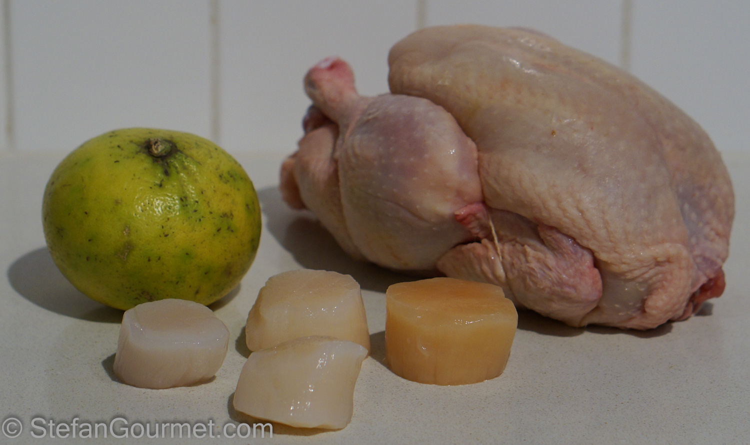 My dish is more simple than what was served at Devero. I couldn’t find yuzu, so I decided to use the most exotic citrus I could find instead, a bergamot orange. I wanted to garnish with green shiso leaves for color, but those were sold out.  I decided to allow the chicken stock to firm up so I could use it as a base for the crispy chicken skin to stand up. Of the bergamot orange I simply used the juice and zest. The dish ended up quite different from what we had at Devero, but very nice indeed with a good combination of flavors and contrast between textures. It’s nice that the dish is only made from three ingredients! (Not counting a bit of salt.) Here’s what I did…