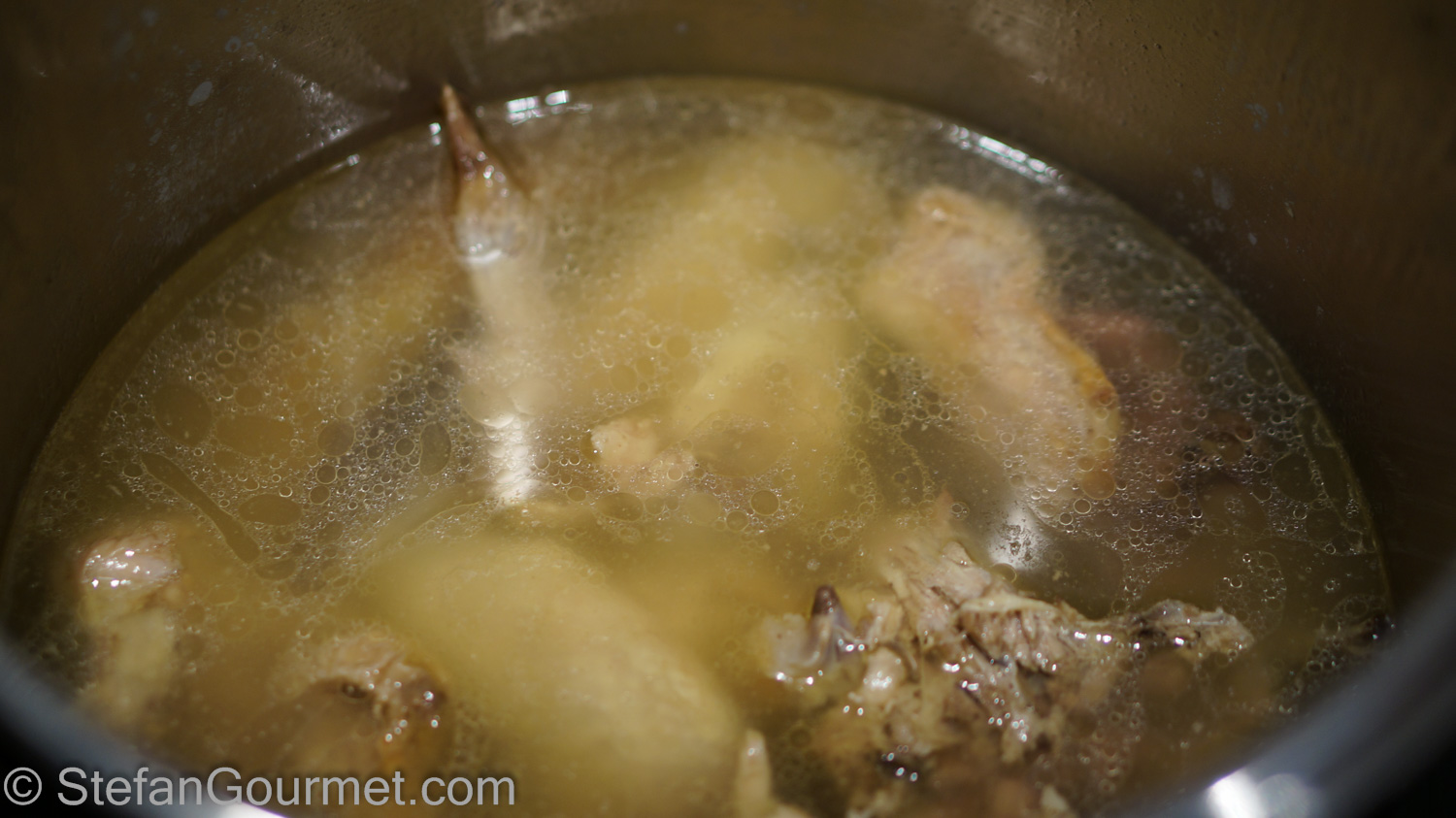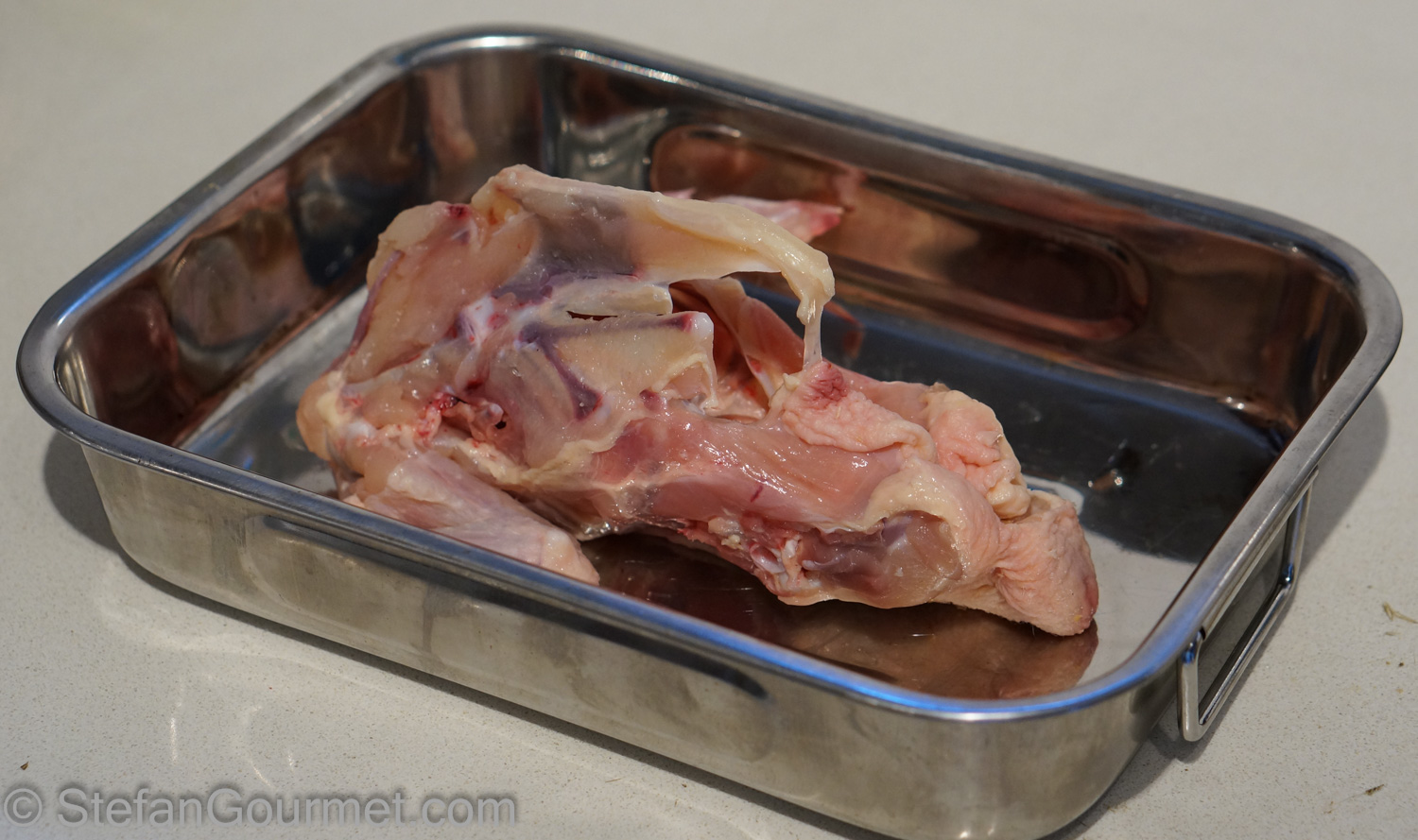 Preheat the oven to 190ºC/375ºF. First remove the skin from the chicken’s breast. Then remove the chicken breast and the legs, and reserve them for another use. Put the carcass in a roasting tray.