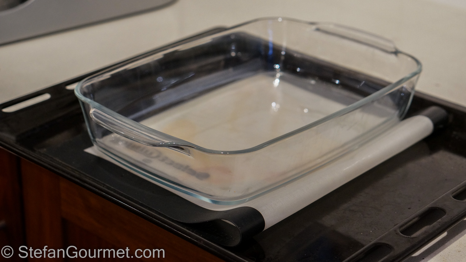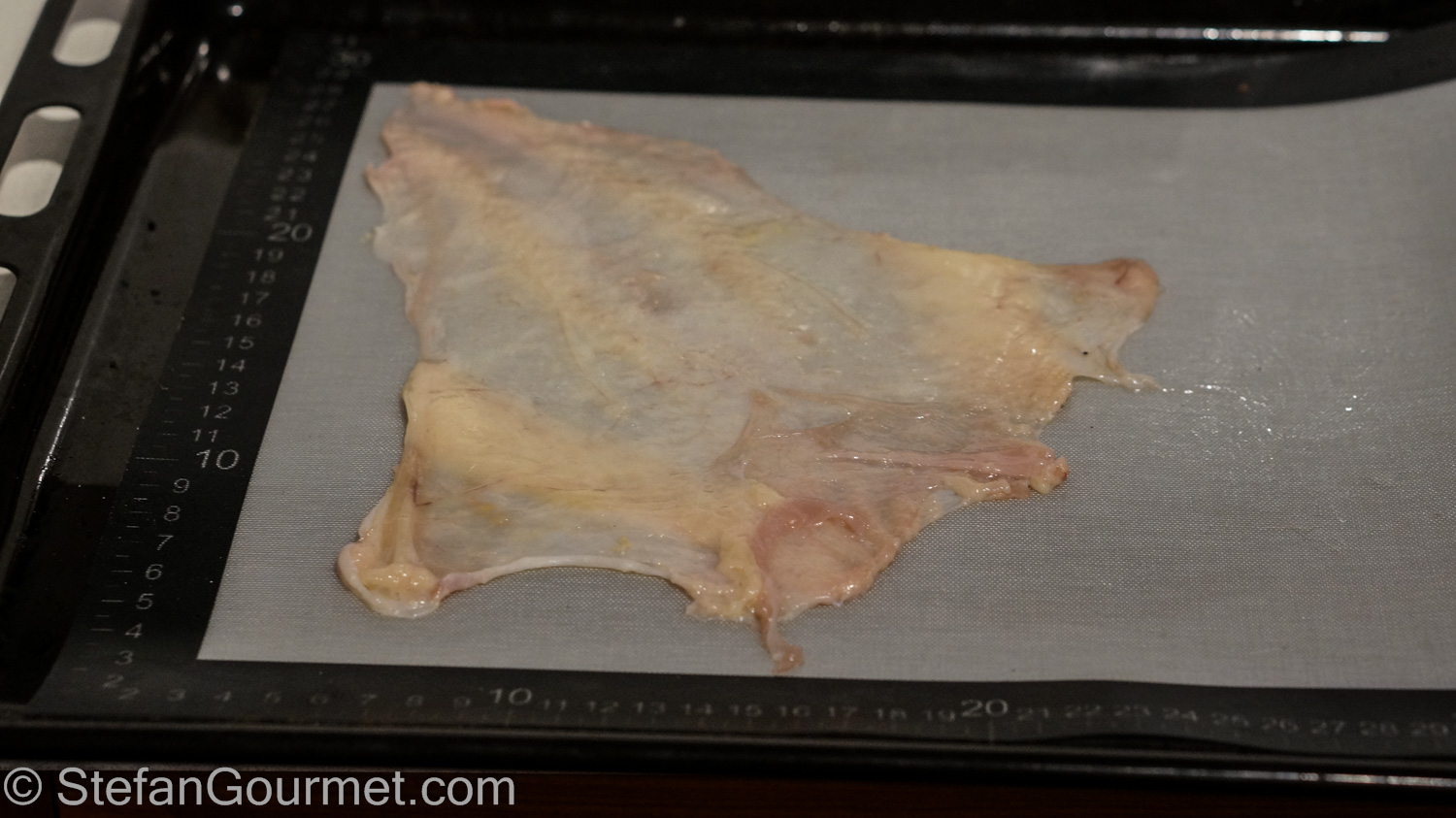 Fold the silicone mat over the chicken skin, so the chicken skin is caught between silicone from both sides. Put a lasagna dish on top…