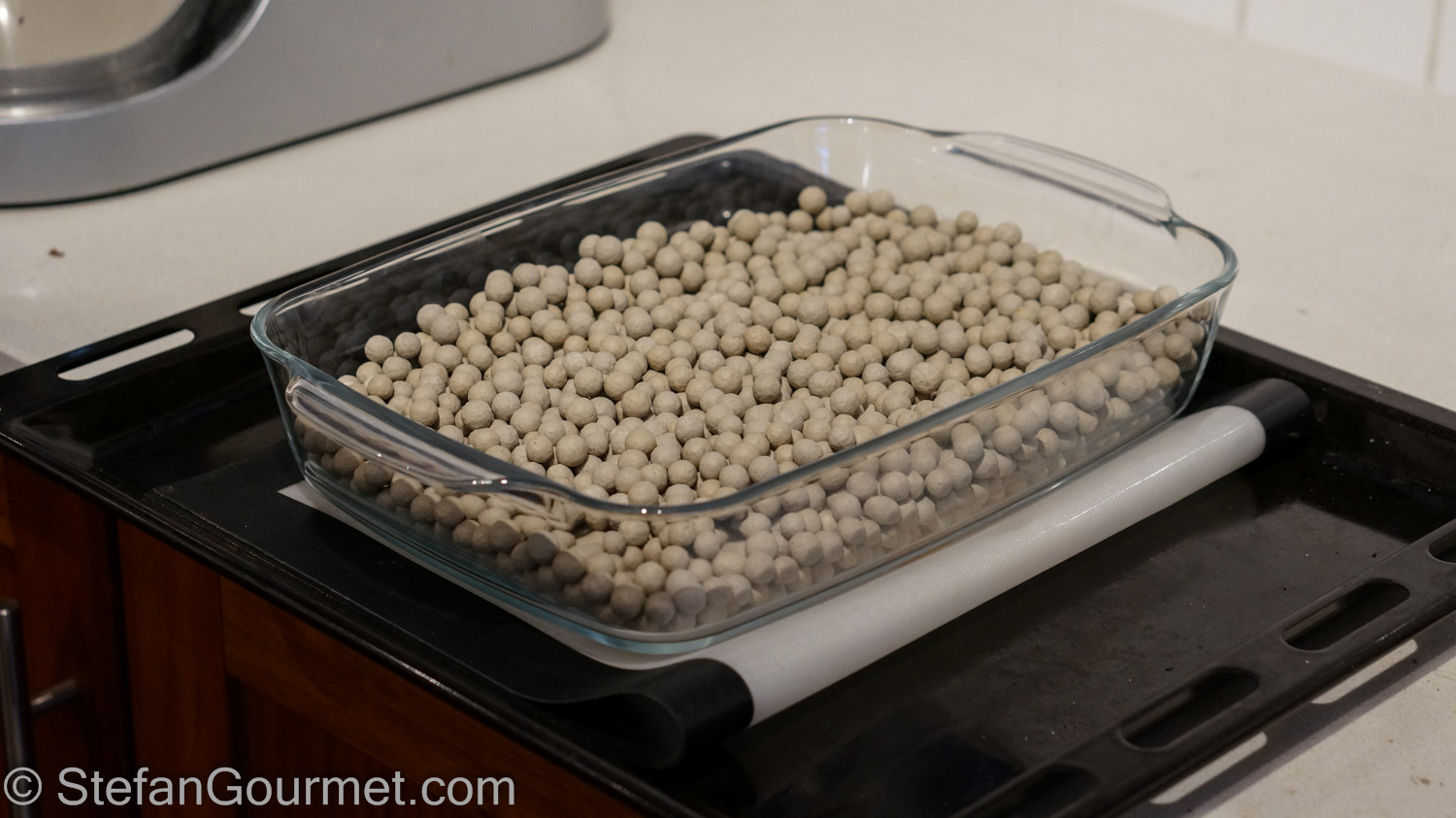 …and fill it with something heavy and oven-proof, like the ceramic beans I normally use for blind baking. Bake the skin between the silicone mats for 45 minutes at 190ºC/375ºF.