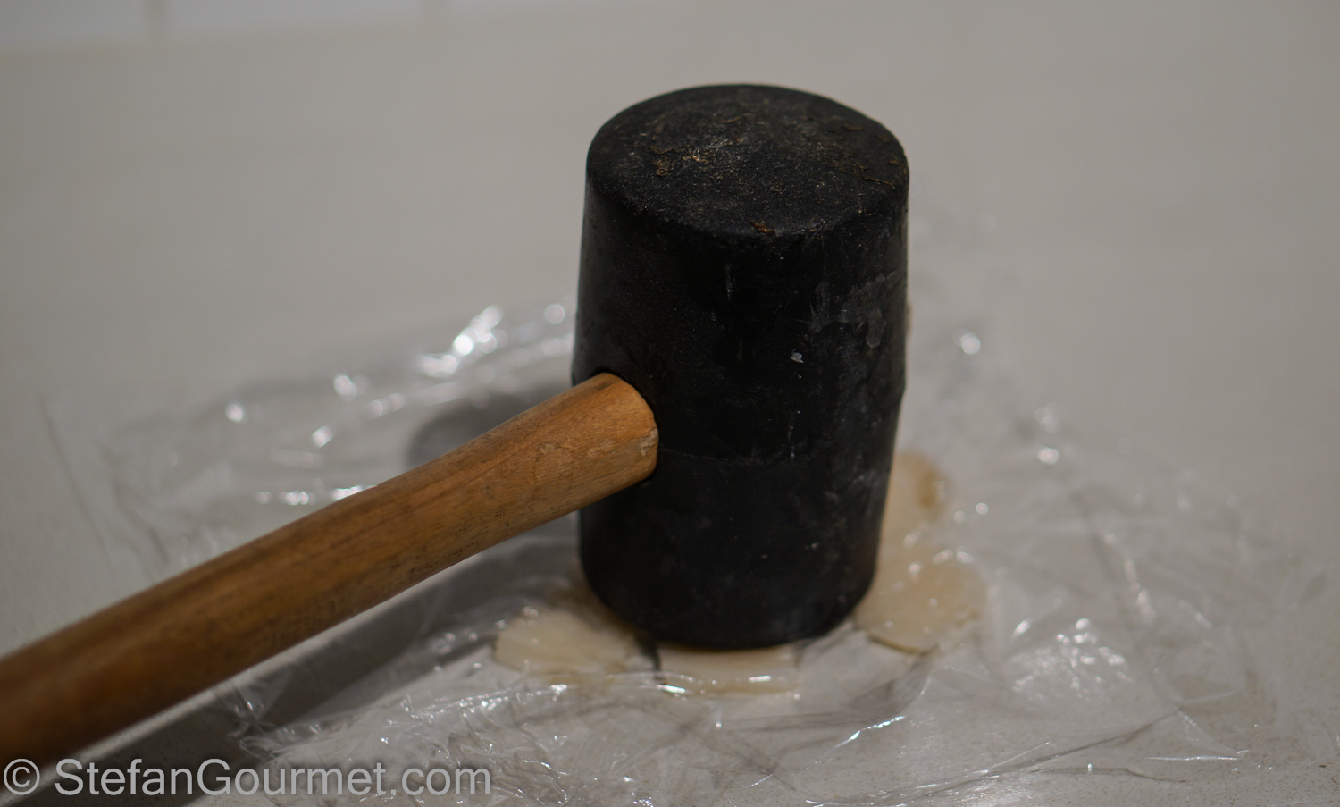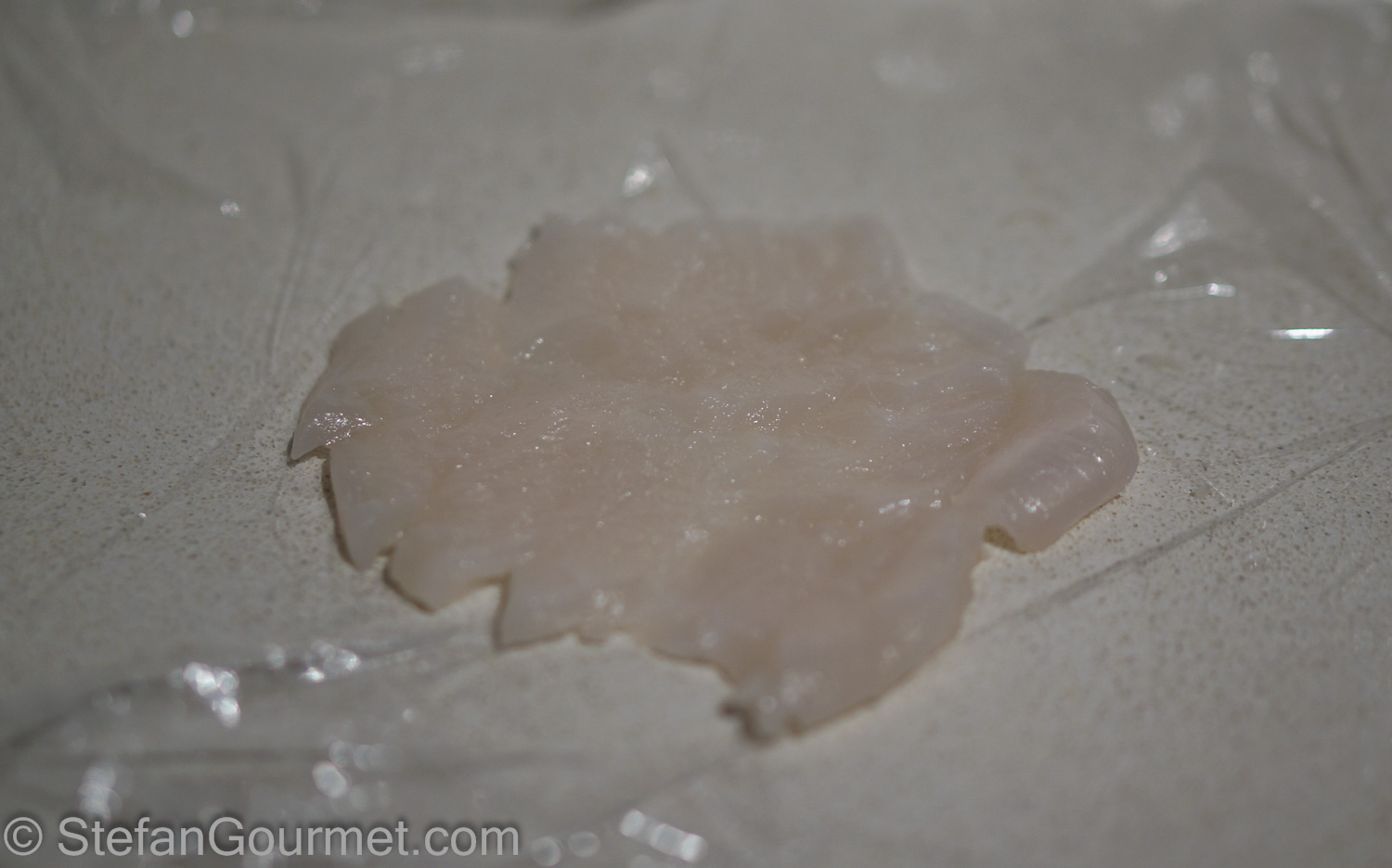 When you are ready to serve, put a scallop between two sheets of plastic wrap and gently pound it to flatten it.