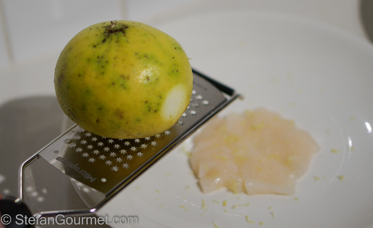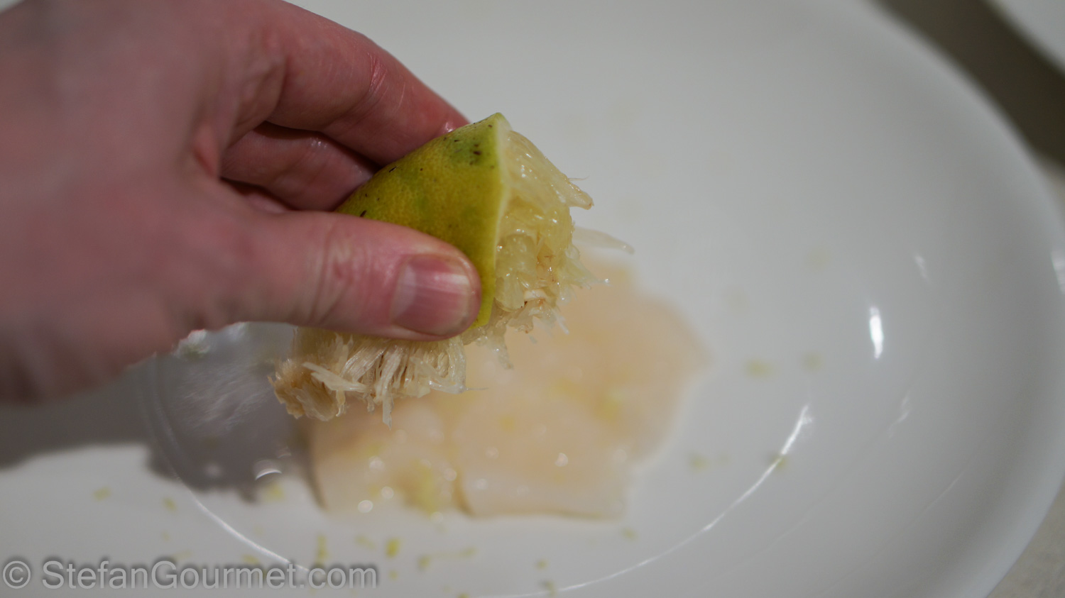 …and squeeze a bit of bergamot juice on the scallop as well. Season with salt only if needed. When you buy sea scallops they are often already shucked and salted.