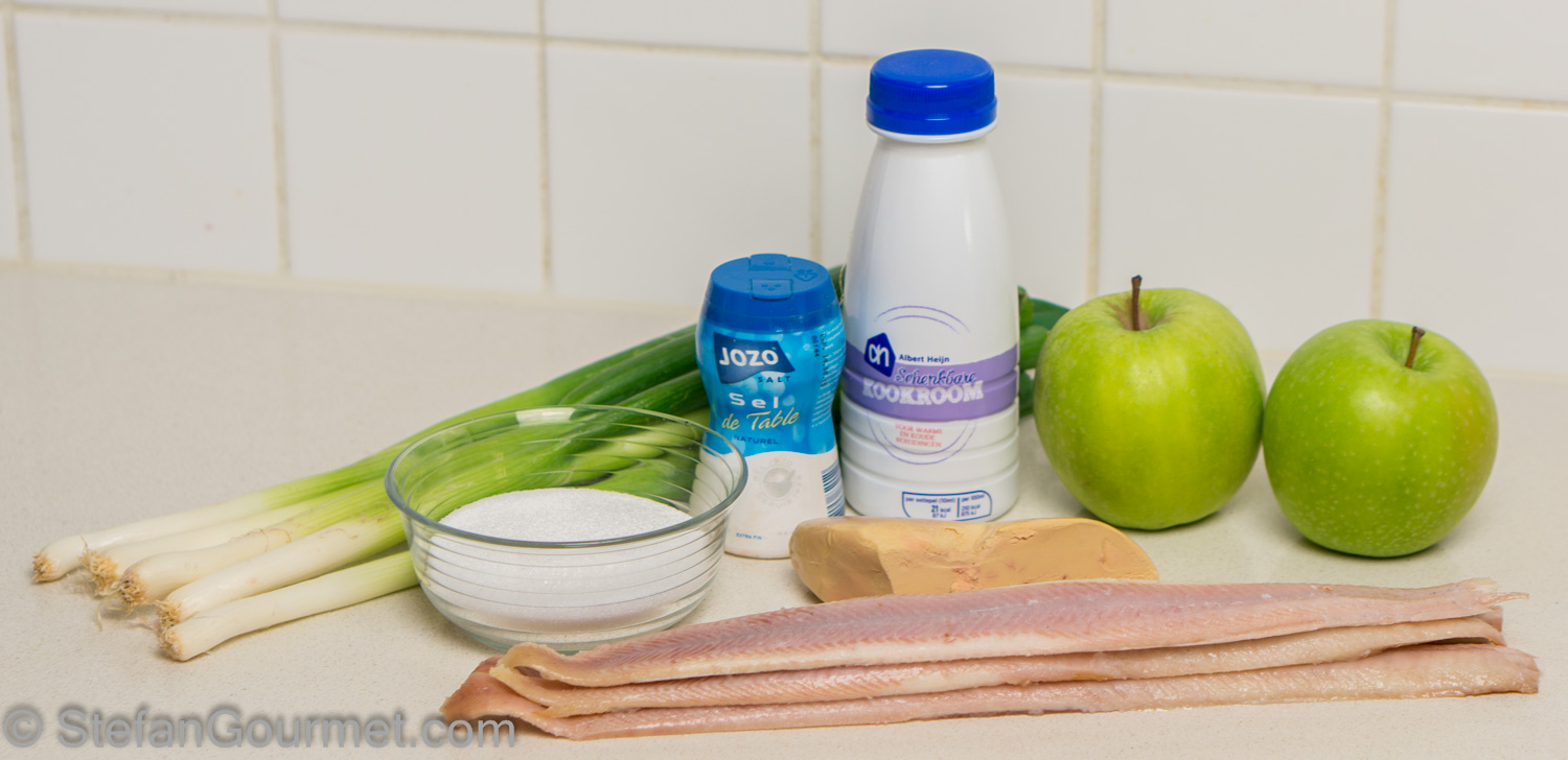 This decadent appetizer was inspired by the signature appetizer of Martín Berasategui, three Michelin star chef from San Sebastian (Spain), “Mille-feuille of smoked eel, foie-gras, spring onions and green apple”. The combination of foie gras with smoked eel and green apple is as amazing in this simplified rendition as it was at the restaurant. The combination of the salty smoky unctuous eel with the velvety foie gras, the crispy sweet/tart apple and the crispy sugar is just wonderful. The puree of spring onions adds yet another layer that works very well.