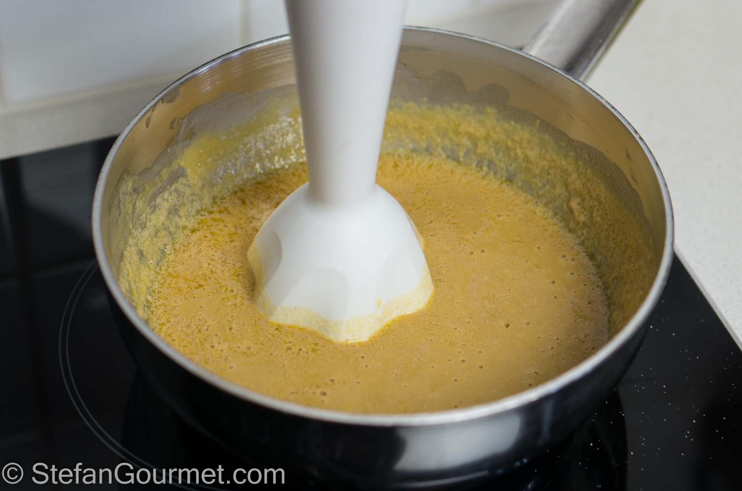 When the foie gras is soft, turn off the heat, season with salt, and blend with an immersion blender.