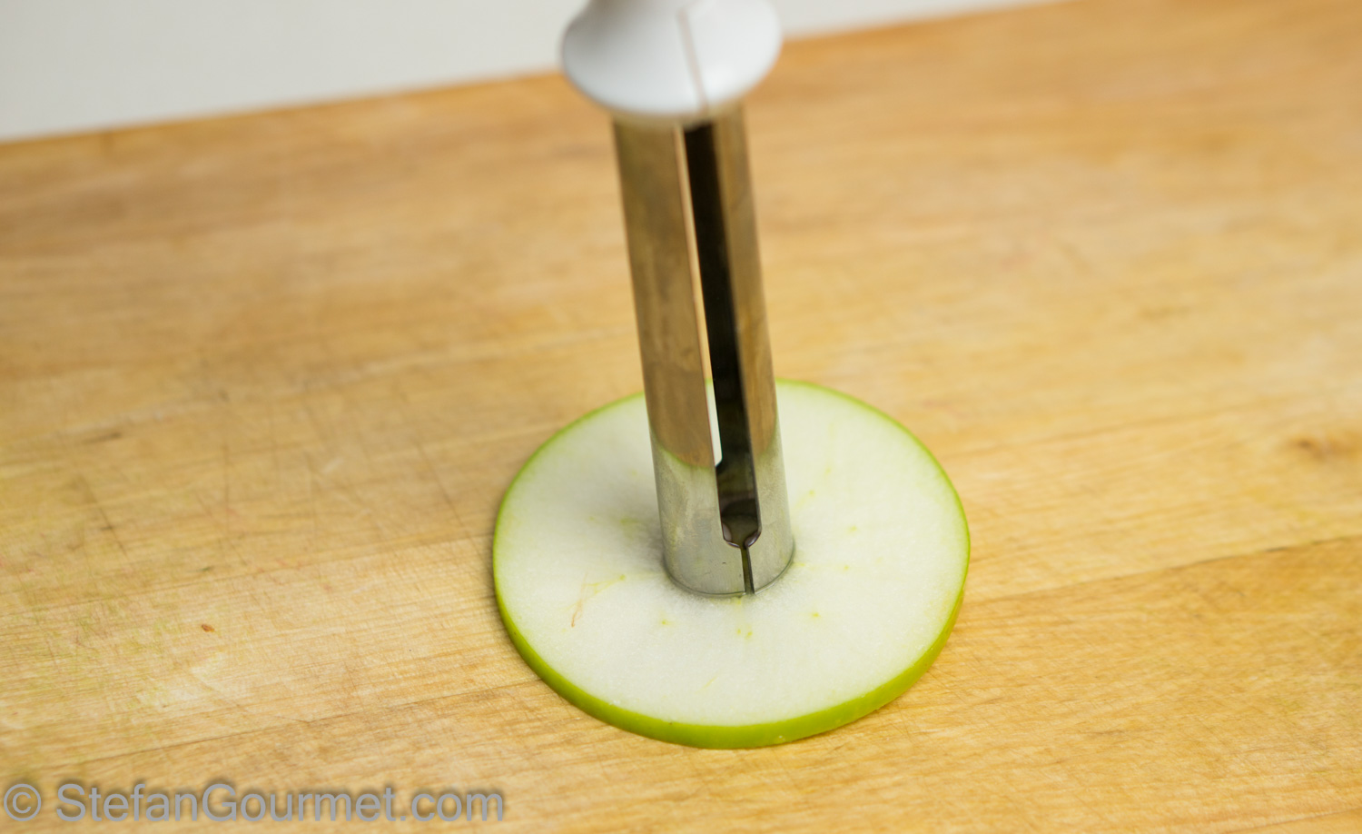 Wash and dry the apples. Cut 8 thin slices out of the thickest part of the apples. Make the slices as even and as thin as you can, about 1 mm (1/24 inch). Remove the core.
