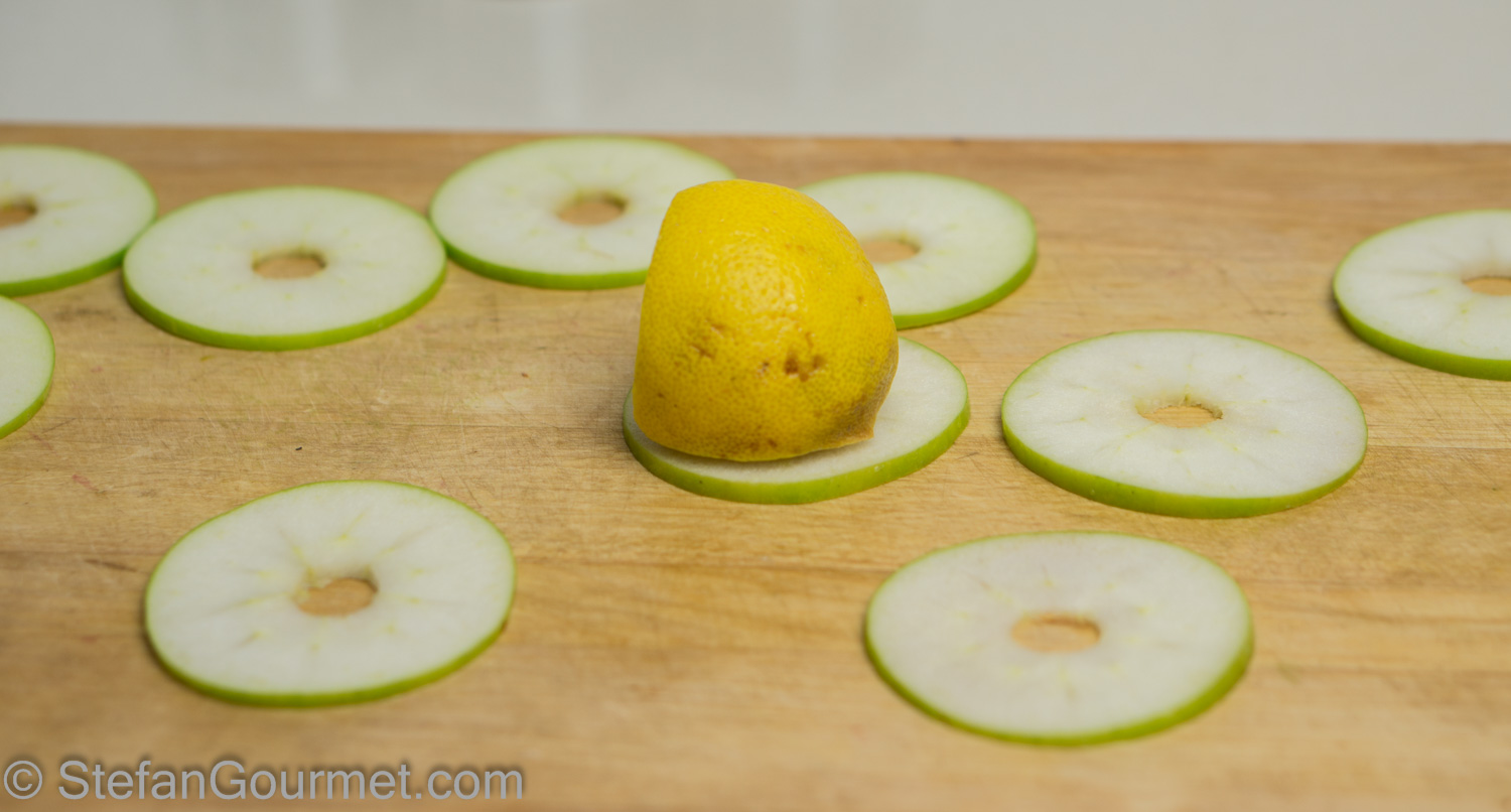 Rub the apple slices with a halved lemon to prevent them from discoloring.