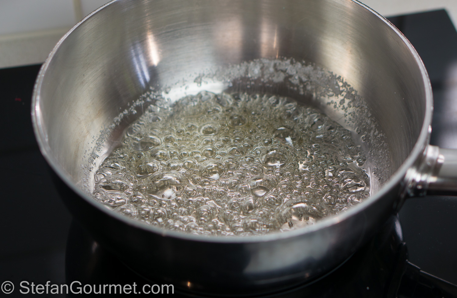 Meanwhile, preheat a baking sheet with a silicone mate at 150ºC/300ºF in the oven. Melt the sugar in a saucepan with just enough water to let is dissolve (as little as possible) over high heat until the sugar barely begins to turn amber.