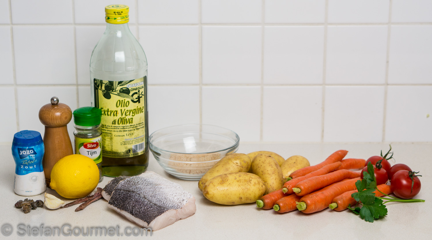 We are having some wonderful weather here — I would sign up for weather like this in Summer — and so during my lunch break I walked to the market to pick up some fresh fish for dinner, to be served outside for the first time this season. I saw some nice hake , and remembered a recipe for white fish gratin from Italian blogging friend Silva that I had noticed a few days ago. This is a variation on the classic Grigliata di Pesce alla Romagnola, fish cooked with breadcrumbs, with the addition of anchovies and capers to the crunchy topping. The fish is baked in the oven instead of broiled. I decided to cook everything in the oven, not just the fish but also the carrots, potatoes and cherry tomatoes to serve as sides. It was a wonderful meal that we enjoyed outside with a nice glass of Soave. Although it does take about an hour to prepare from start to finish due to the time needed to roast the potatoes and carrots, it is not a lot of work — and an easy clean up if  you have a self-cleaning oven like I have! (I recommend everyone to get such a self-cleaning oven by the way, which cleans by heating up to about 500ºC/950ºF. After 13 years my oven still looks almost like new, even though I use it often and I’ve only used the automatic cleaning and never any chemical oven sprays and the like.)
