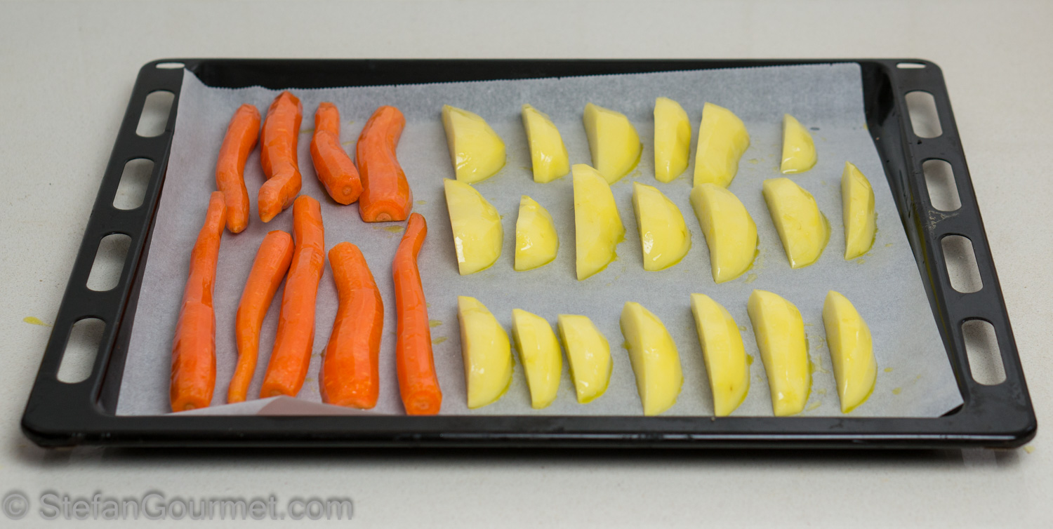 Preheat the oven to 225ºC/440ºF. Peel the carrots and the potatoes. Cut the potatoes into wedges. Make sure the carrots and potatoes are all of a similar size. Toss the potatoes and carrots with olive oil. Arrange the potatoes and carrots on a baking sheet lined with oven paper. Roast in the oven at 225ºC/440ºF for 20 minutes.