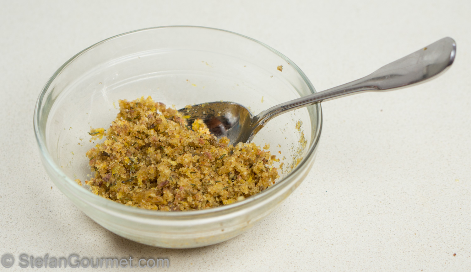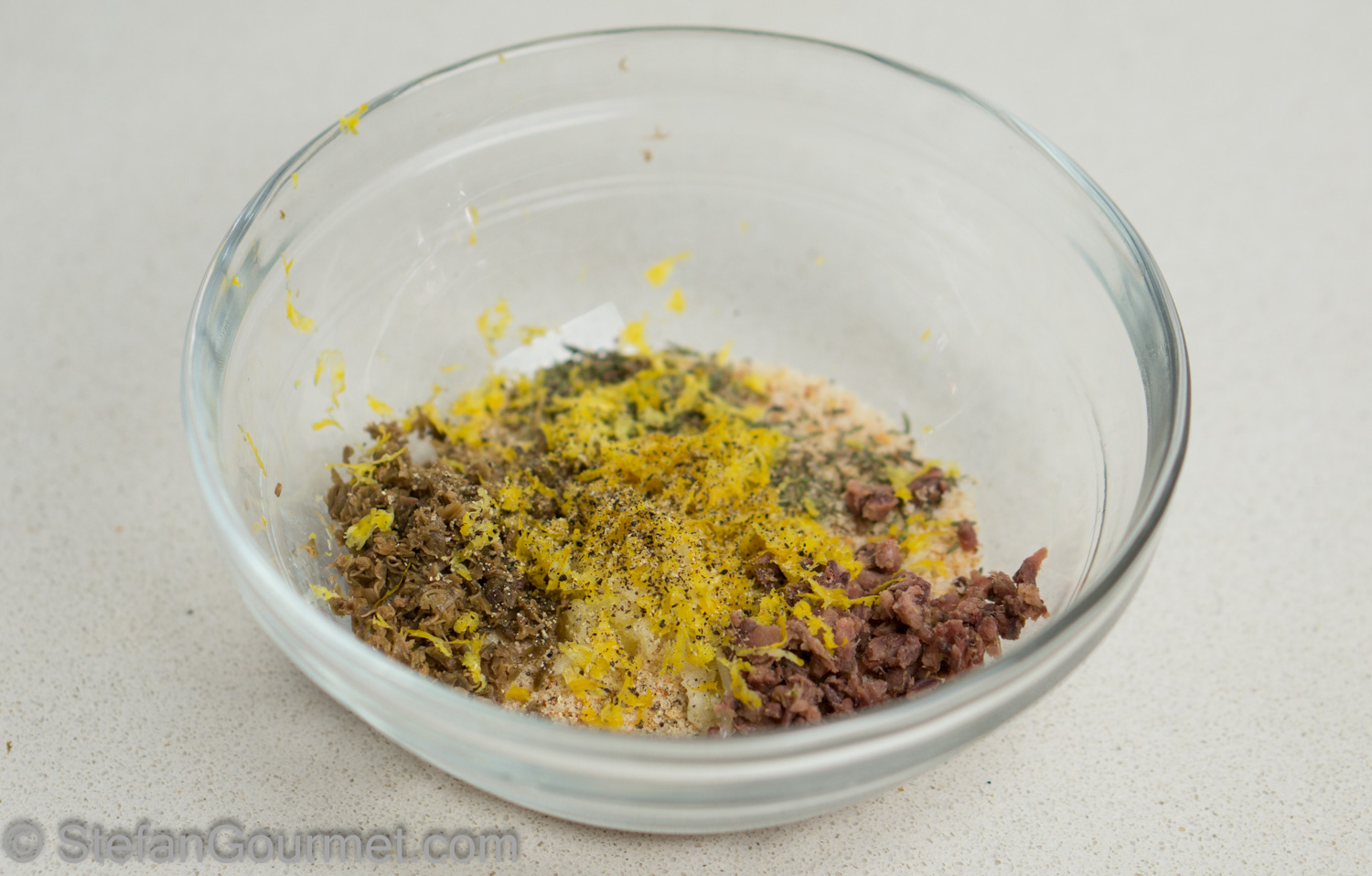 Meanwhile, in a bowl combine the breadcrumbs, anchovies, garlic, capers, lemon zest,  thyme, and freshly ground black pepper.